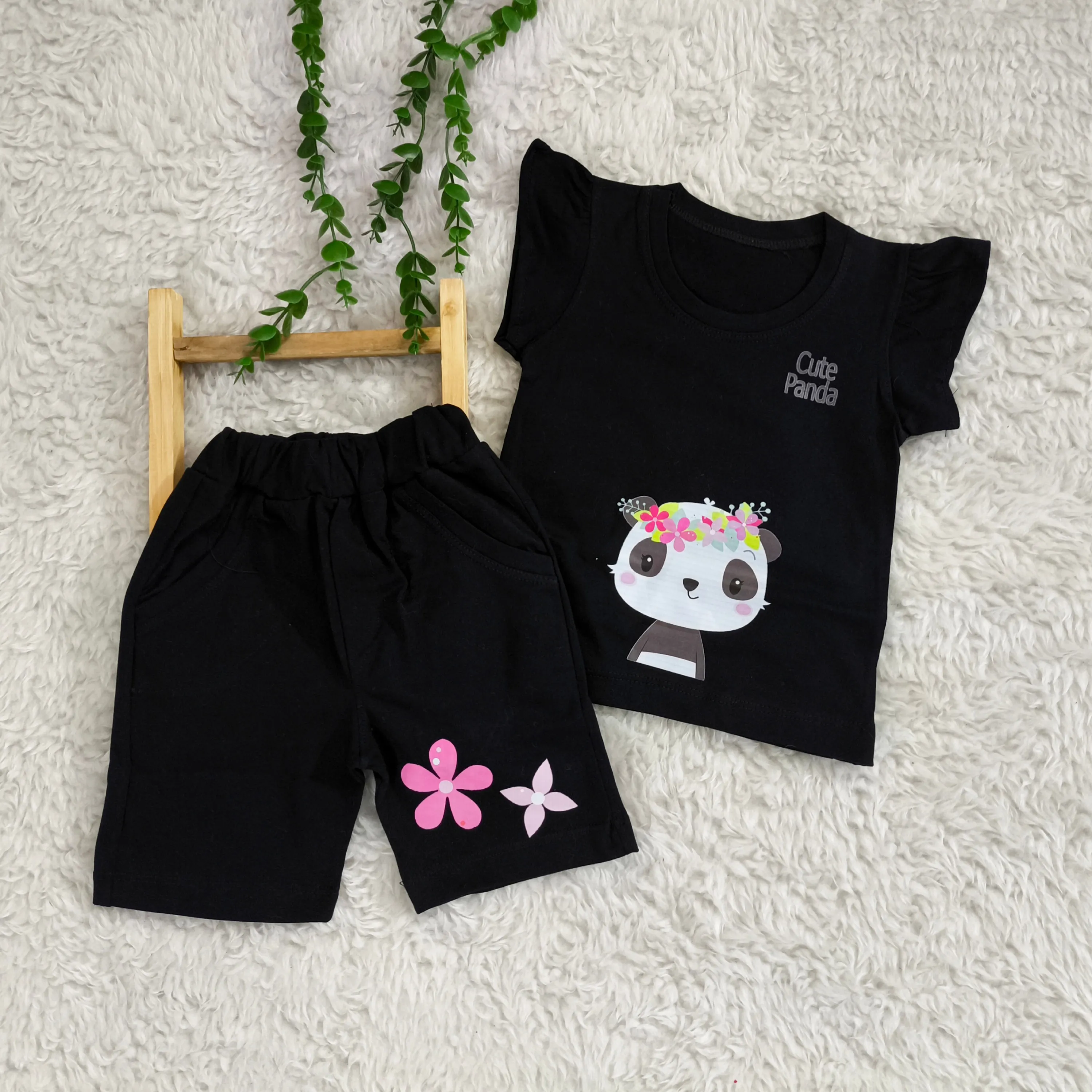 تاپ شلوارک مشکی طرح پاندا دخترانه نخی خنک تابستانی مناسب 1 تا 3 سال