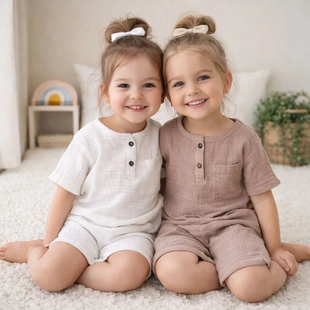 ست تیشرت و شورتک نخی طرح بابونه دخترانه و پسرانه خندان