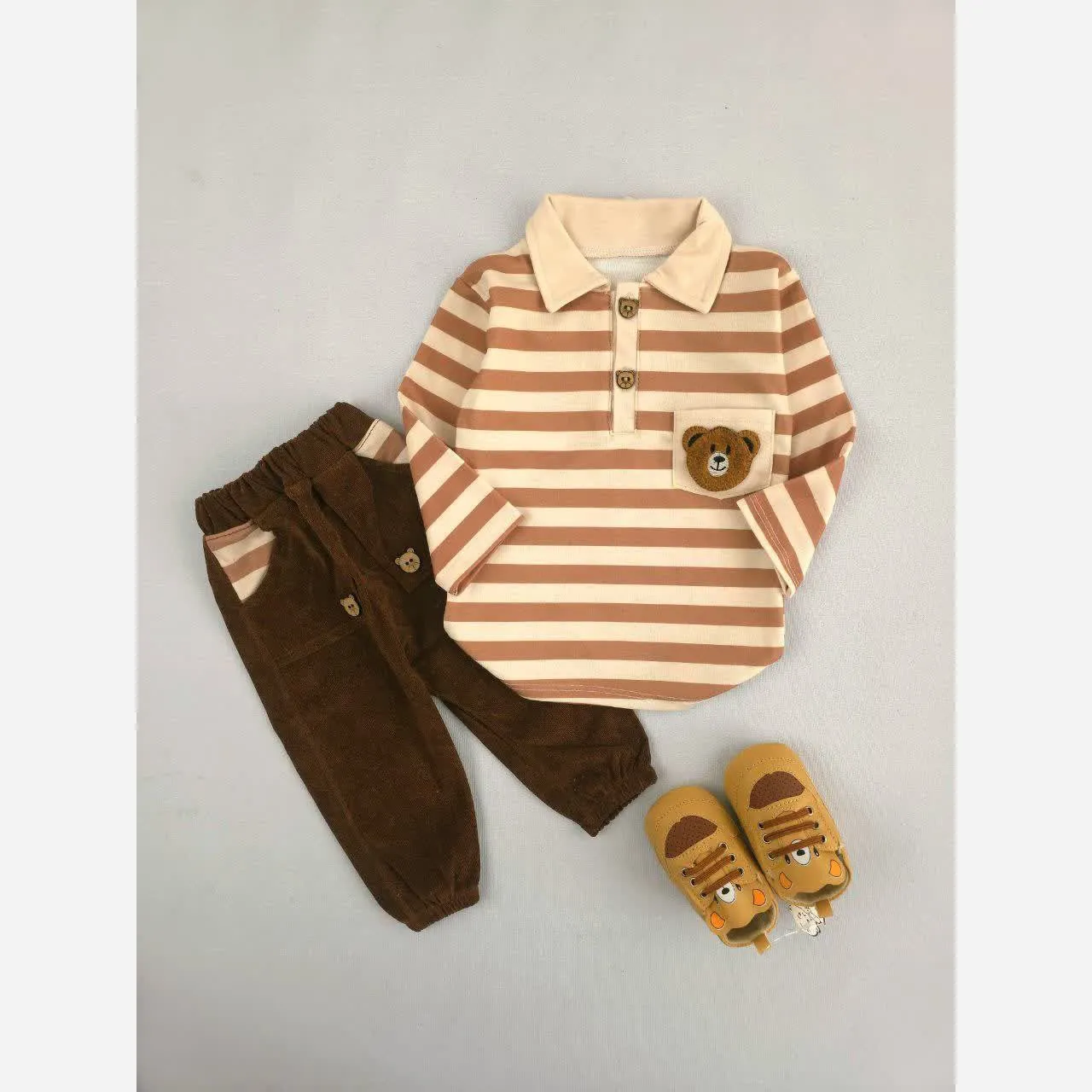 بلوز شلوار راه راه طرح خرس تدی بچگانه | دخترانه و پسرانه | جنس پنبه و مخمل کبریتی