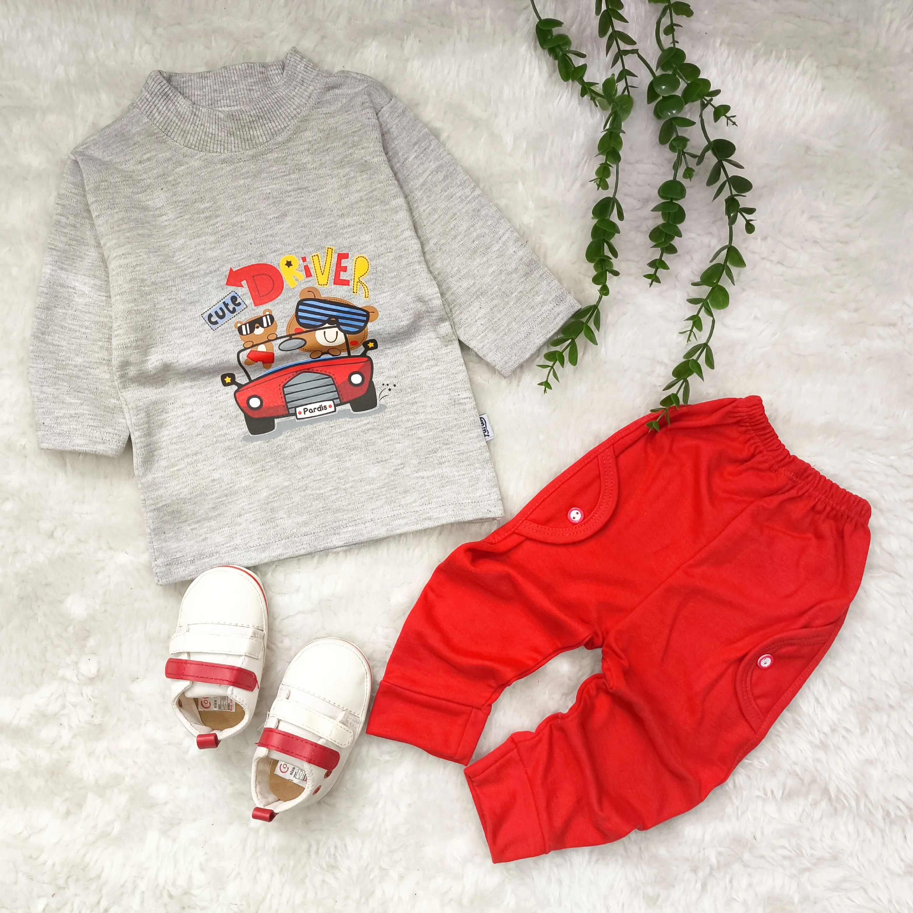 بلوز شلوار پسرانه طرح خرس راننده آستین بلند پنبه ای نخی مناسب 6 ماه تا 2 سال