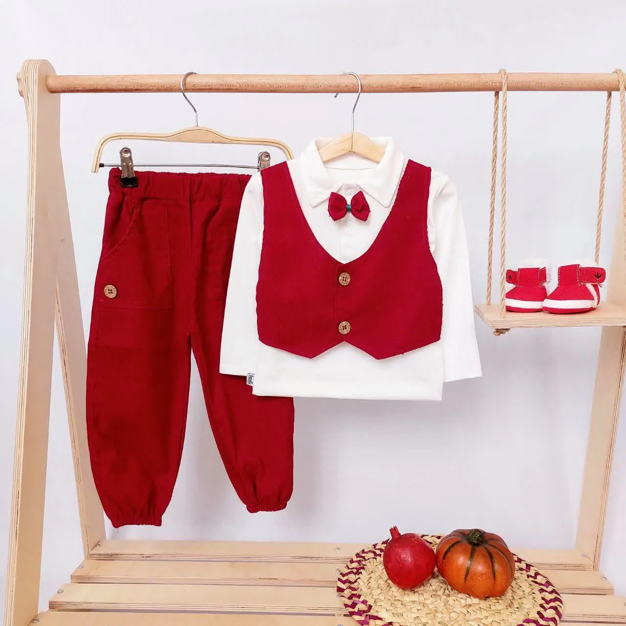 ست لباس پسرانه یلدایی طرح جلیقه و پاپیون مخمل کبریتی قرمز | لباس نوزادی و کودک