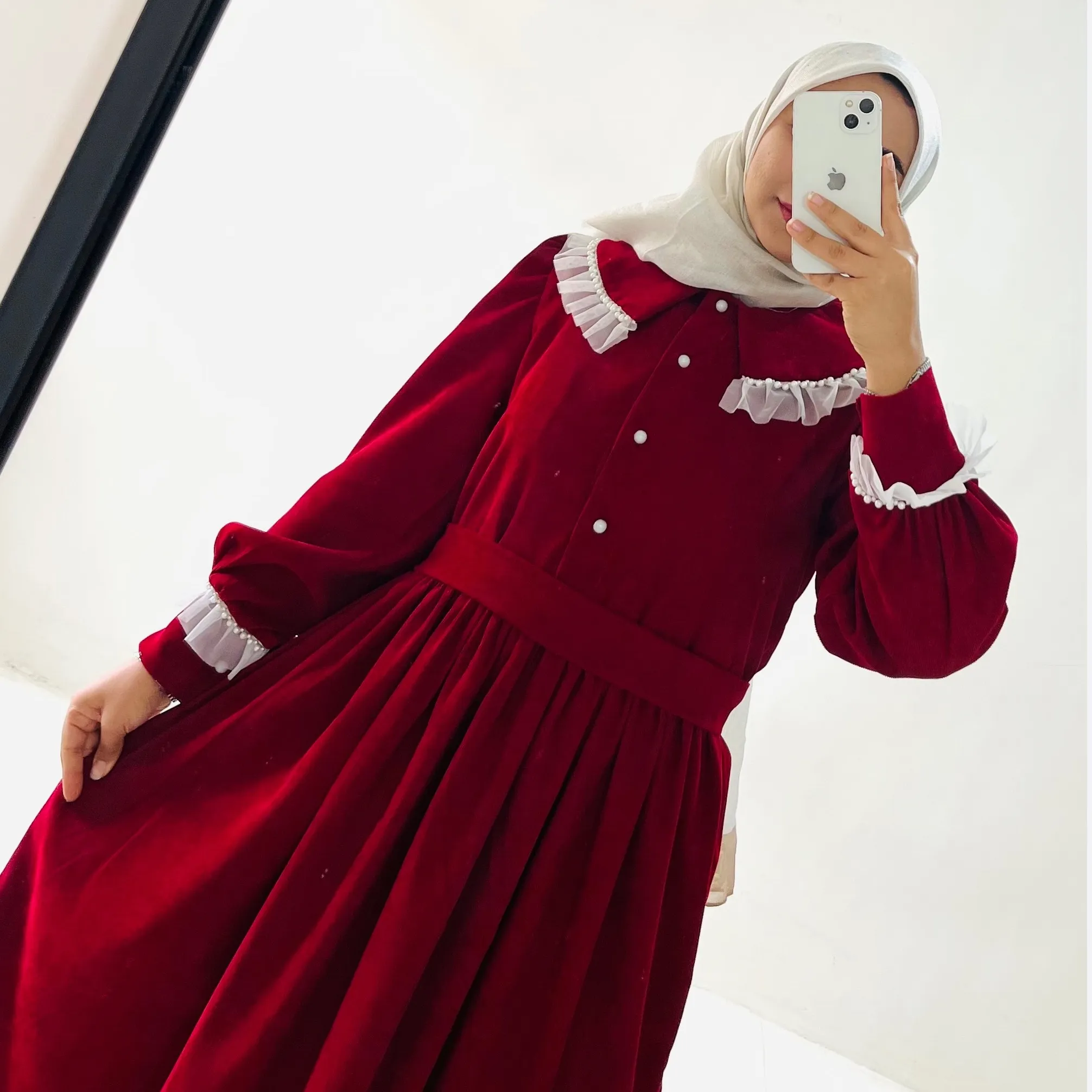 پیراهن قرمز با خرج کار تور و مروارید تزئیین شده و دکمه خور هست