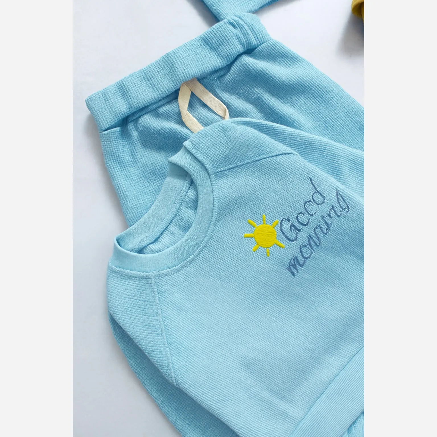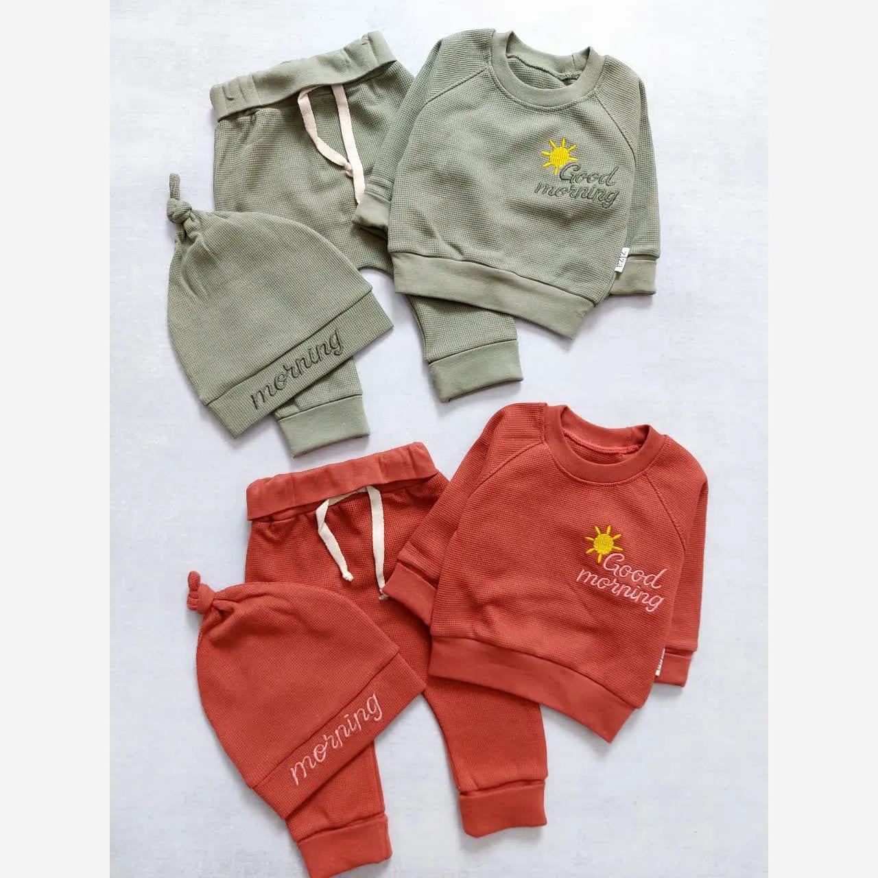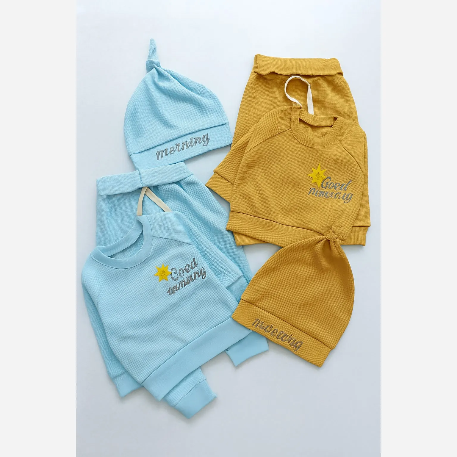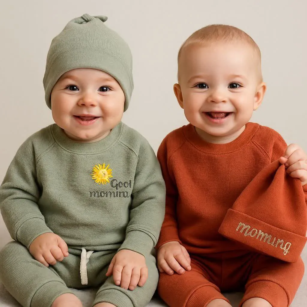 ست بلوز شلوار و کلاه نوزادی طرح Good Morning جنس پنبه بیسکوئیتی با کیفیت