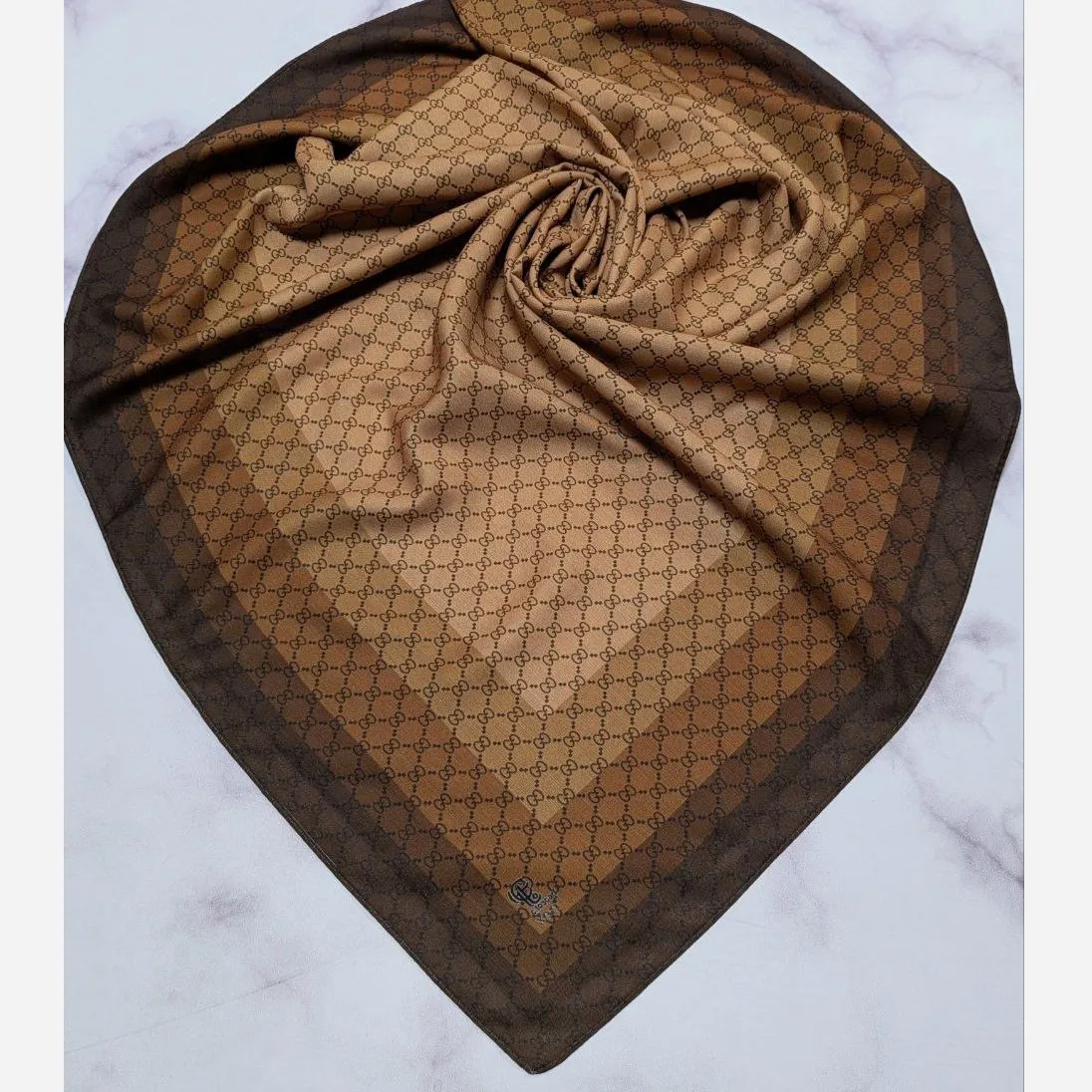 این روسری با طرح الهام گرفته از گوچی، انتخابی شیک و بهروز برای استایل شماست. رنگ نسکافهای زمینه با حاشیه قهوهای، ترکیبی جذاب و هماهنگ را ایجاد کرده که با ترندهای امسال همخوانی دارد.