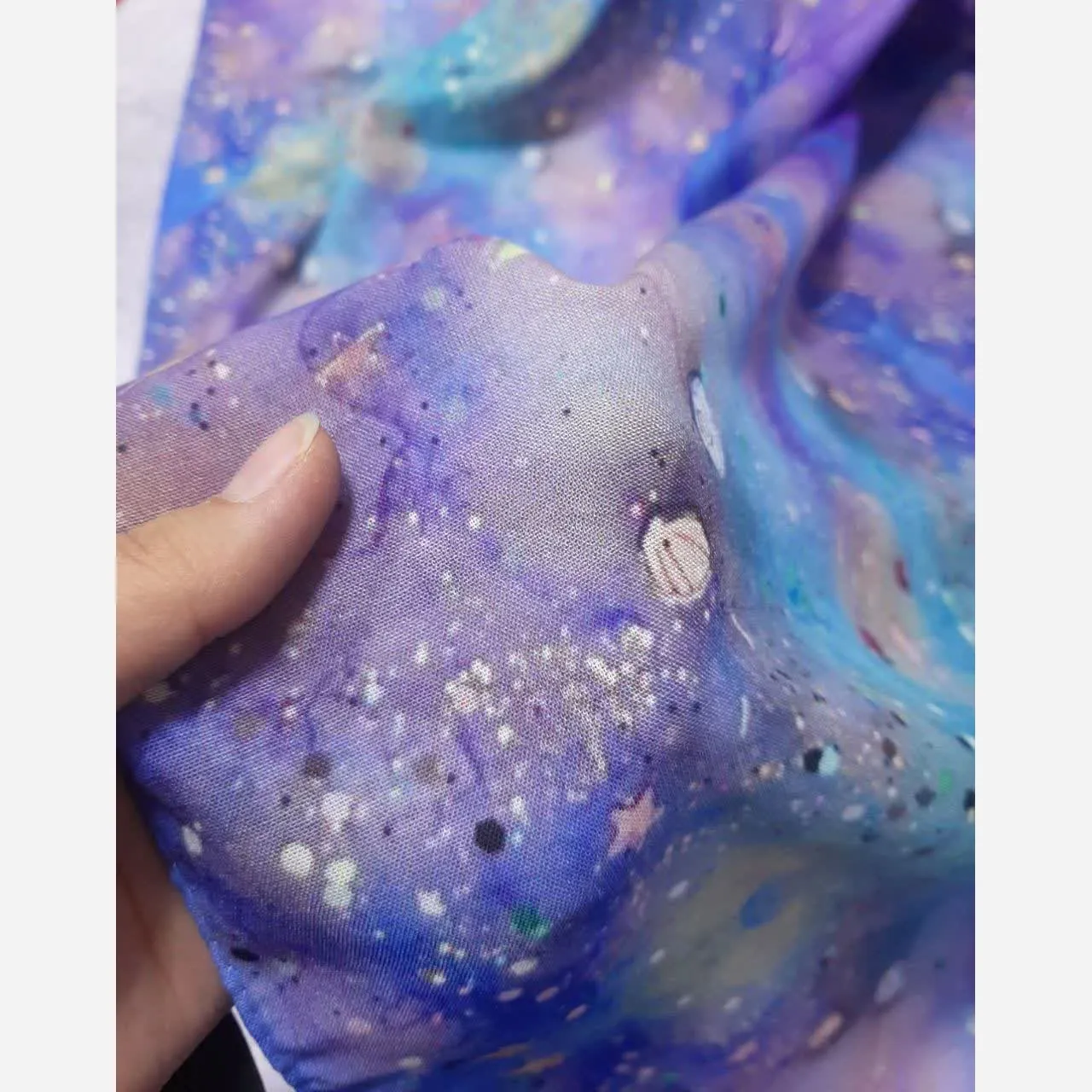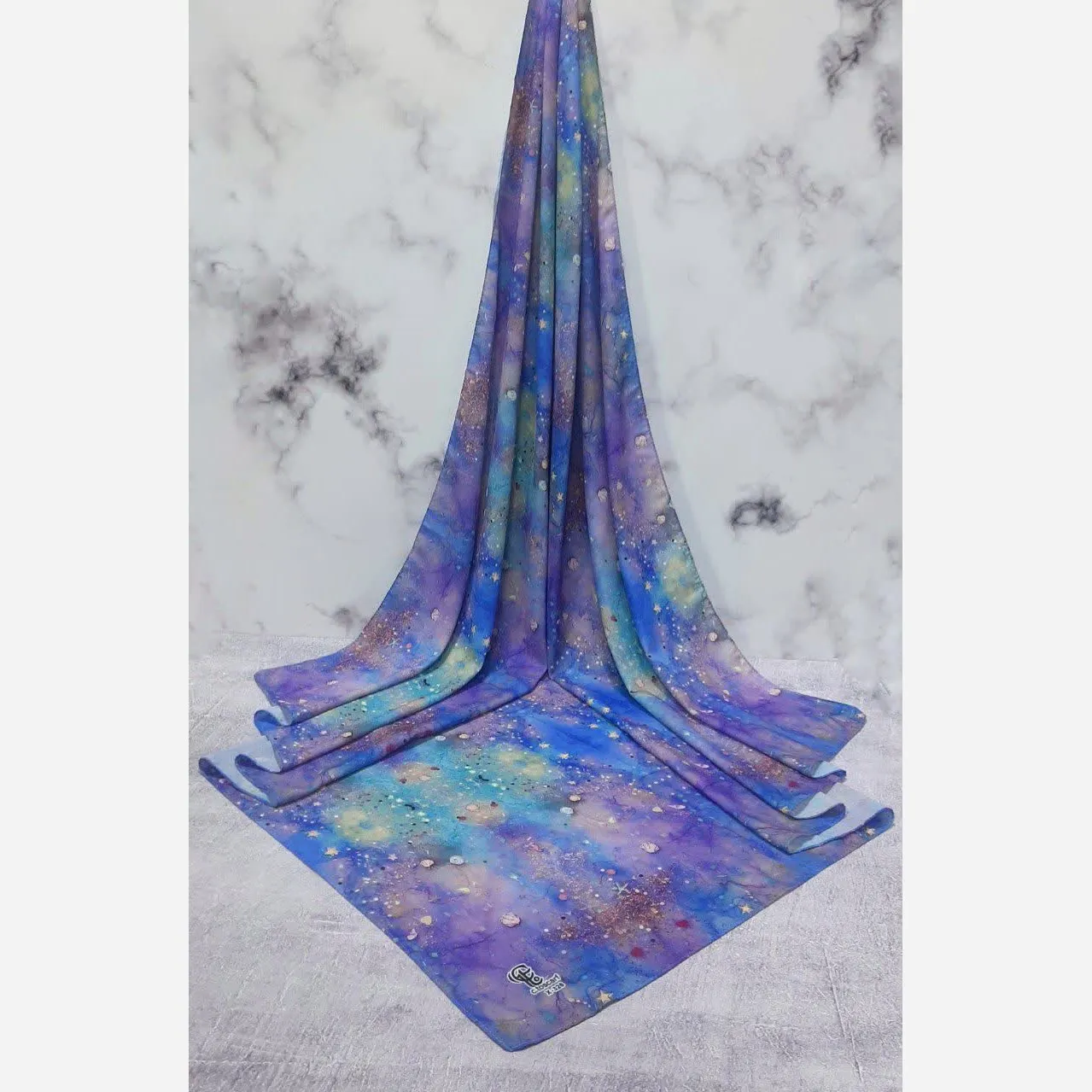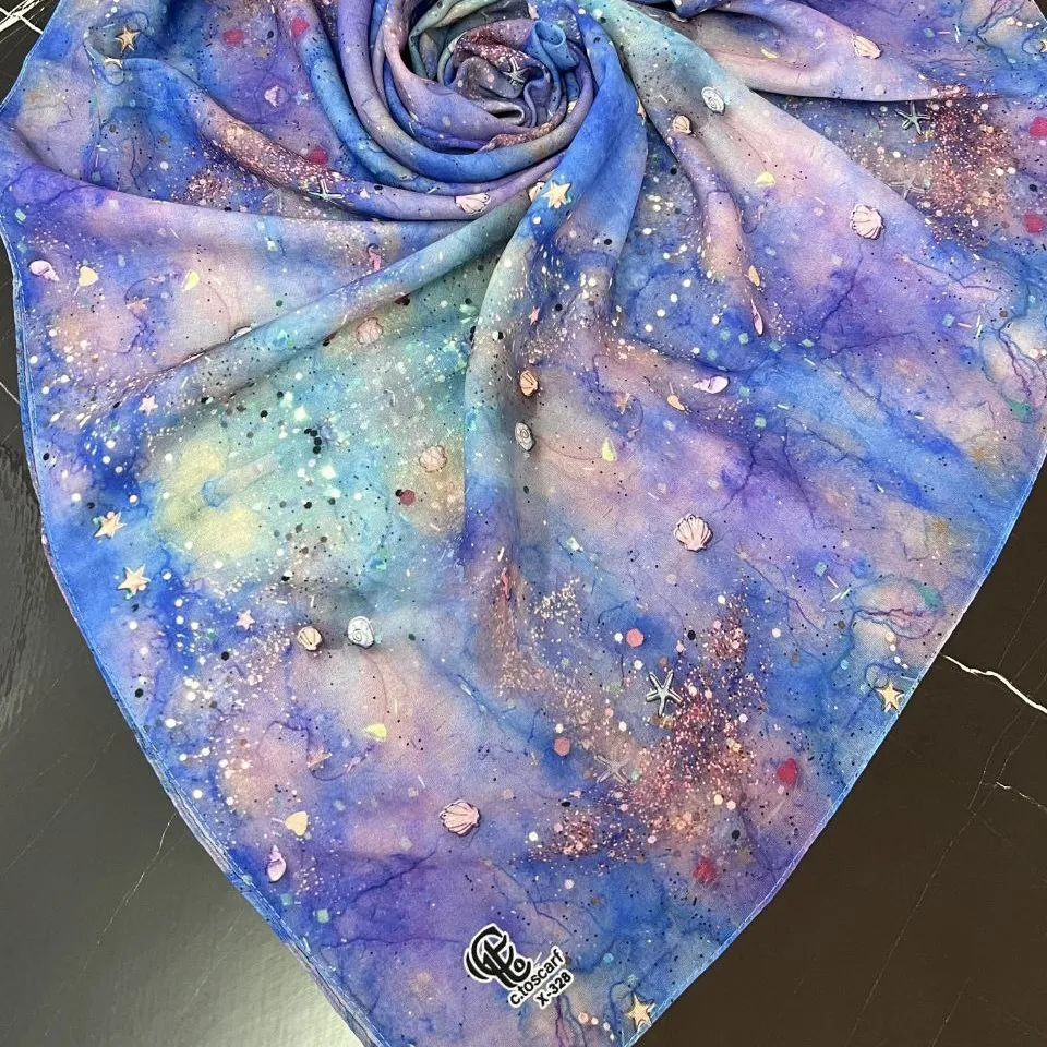 این روسری با الهام از زیباییهای ساحل و عمق دریا طراحی شده است. طرح کهکشانی و ستاره دریایی آن، حسی از آرامش و خاص بودن را به استایل شما میبخشد.