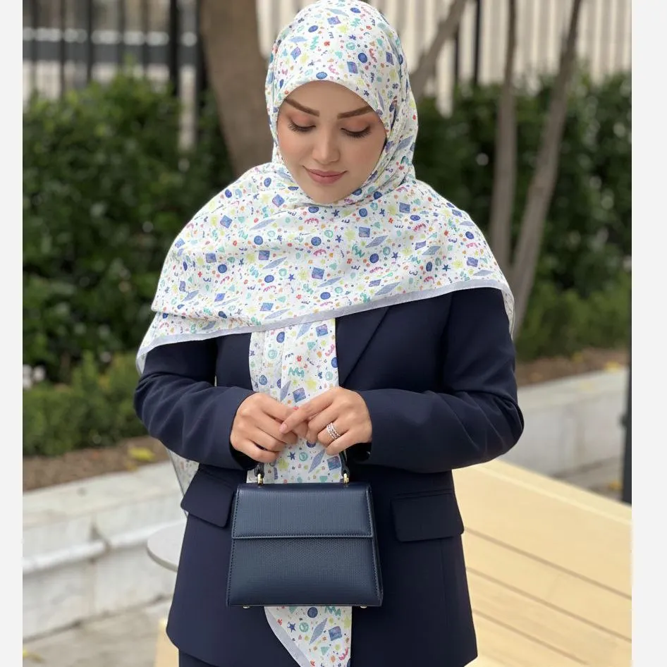 این روسری زنانه با زمینه سرمهای خوشرنگ و طرح اشکال هندسی ریز، انتخابی ایدهآل برای تکمیل استایل شما در موقعیتهای مختلف است. تنوع طرح و رنگبندی این روسری به شما امکان میدهد تا به راحتی آن را با انواع لباسهای خود ست کنید.