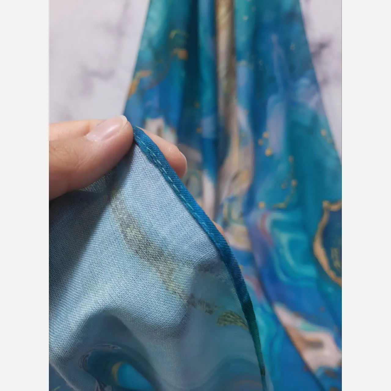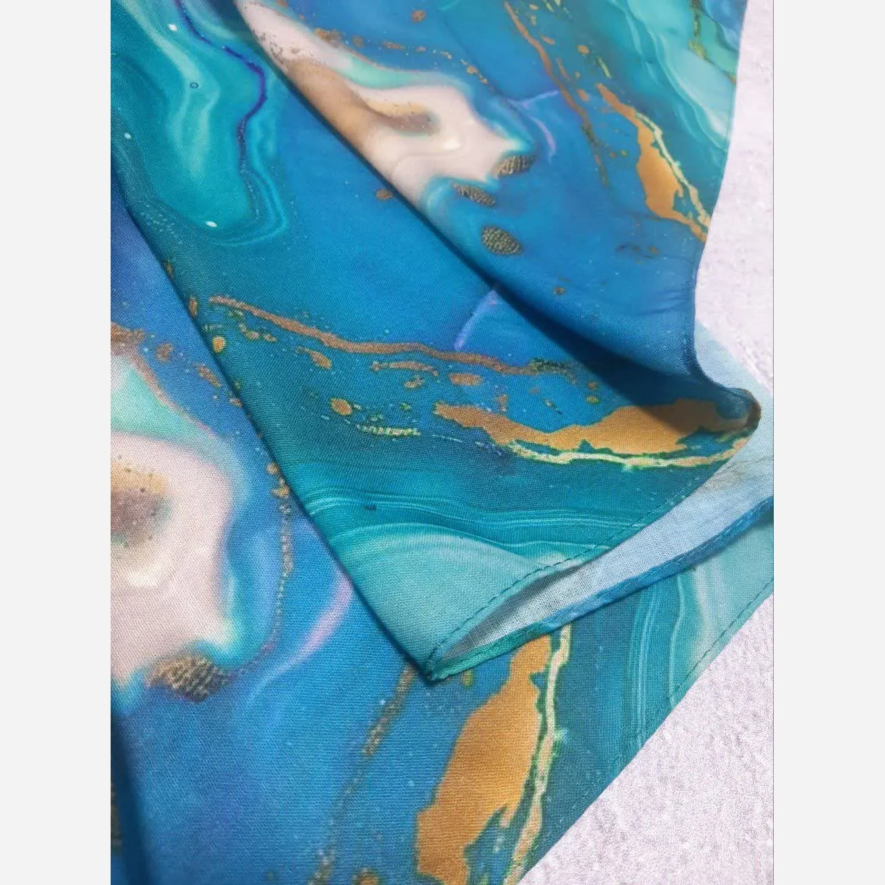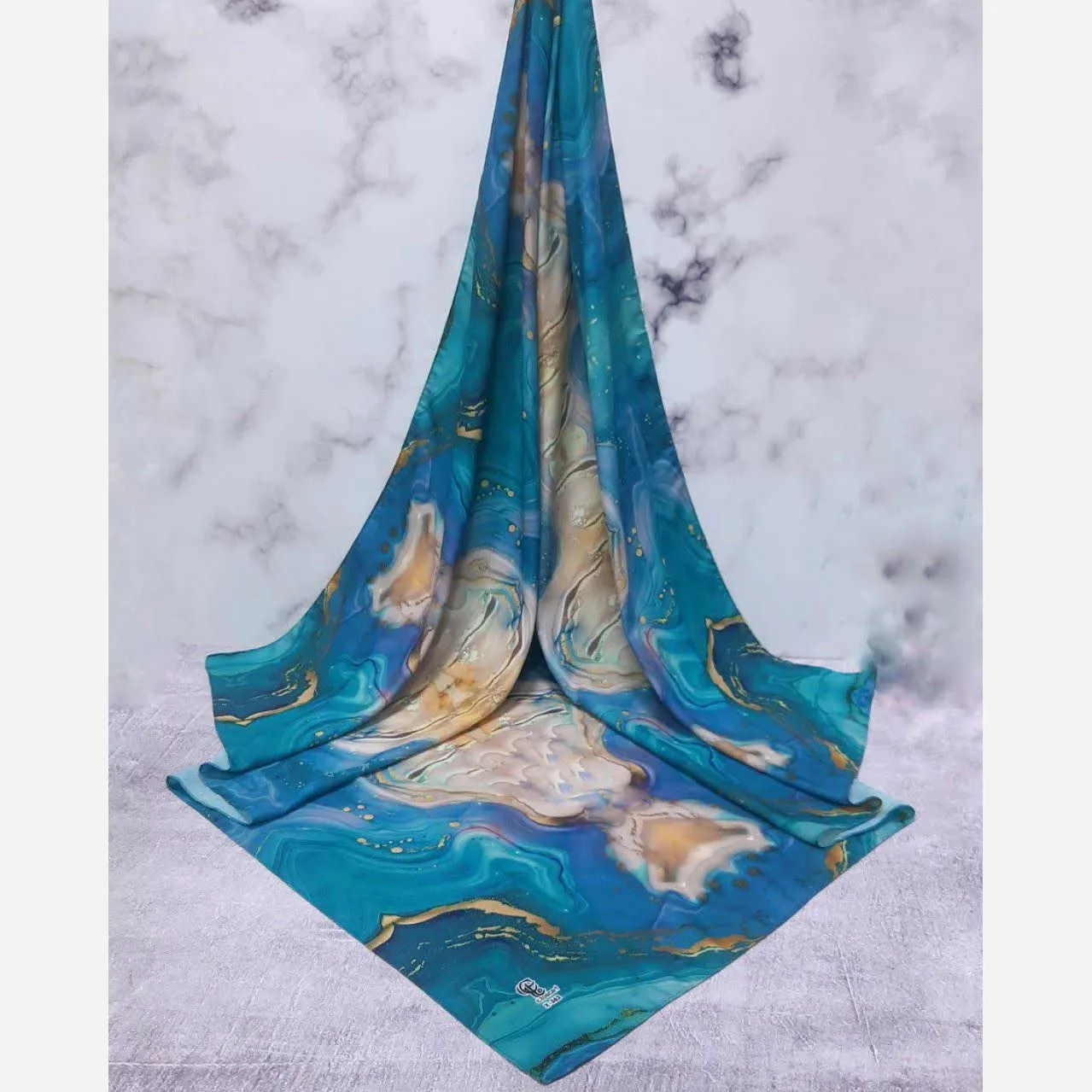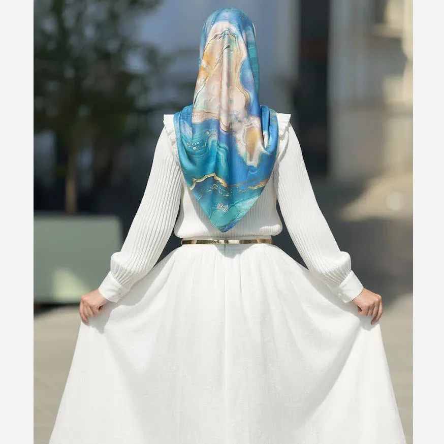 روسری طرح اطلس دریایی قواره بزرگ دور دوخت مزونی شیک زنانه