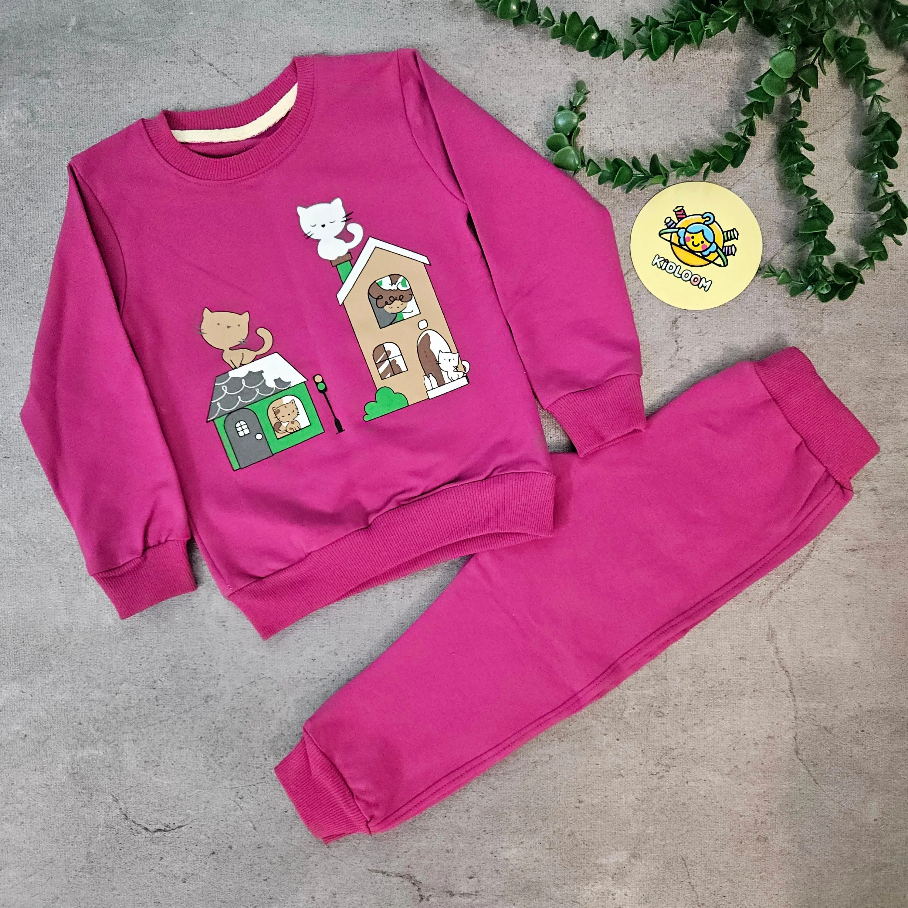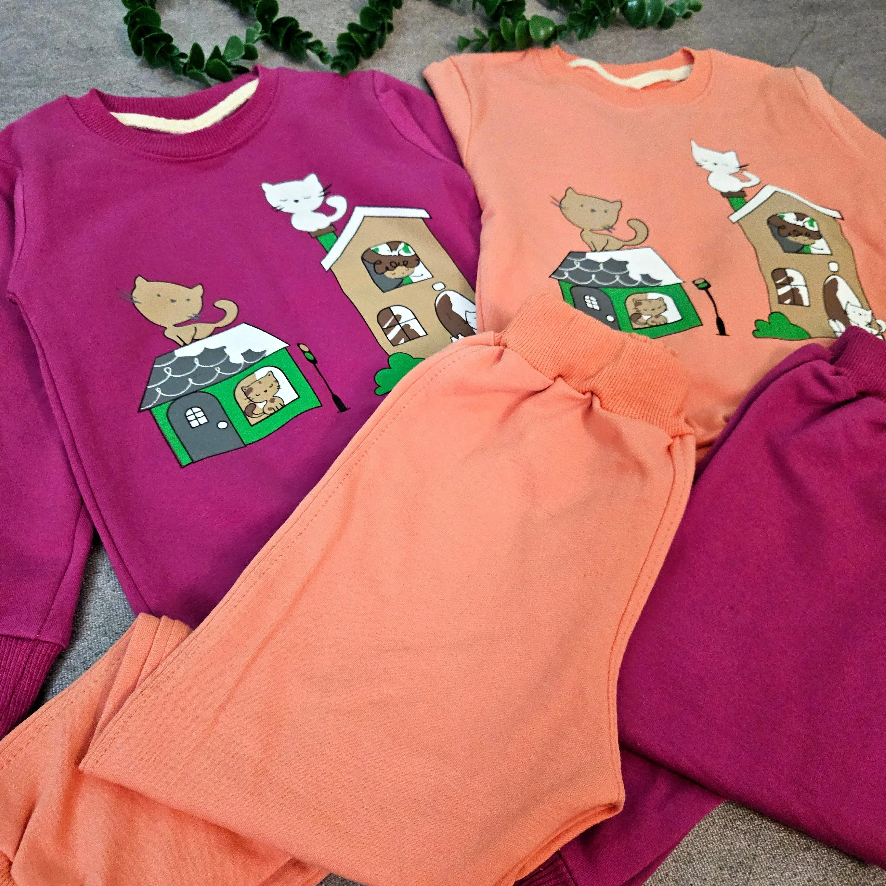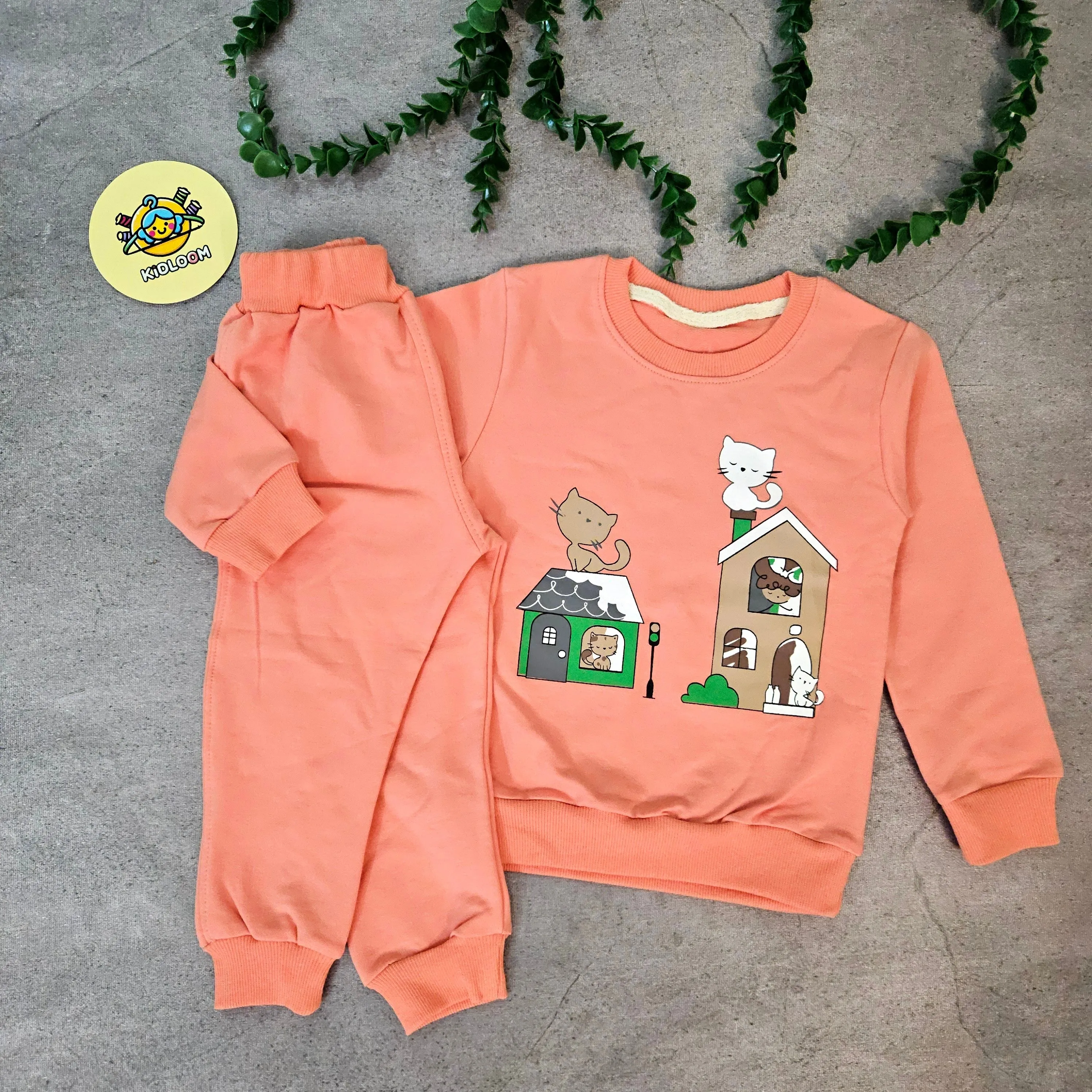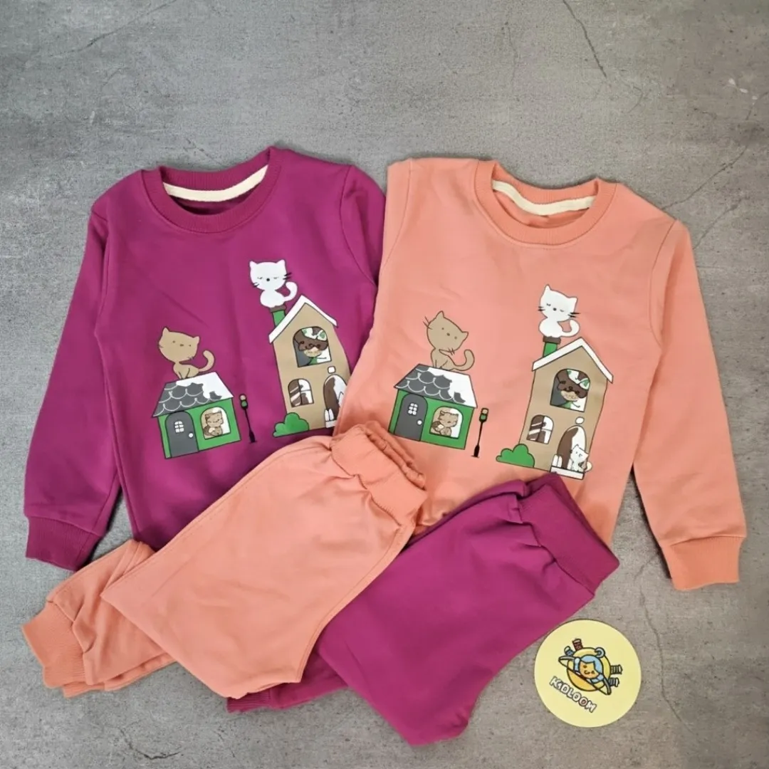 ست بلوز و شلوار بچگانه طرح گربه و خانه، پنبه دورس لاکرا، مناسب 1 تا 5 سال
