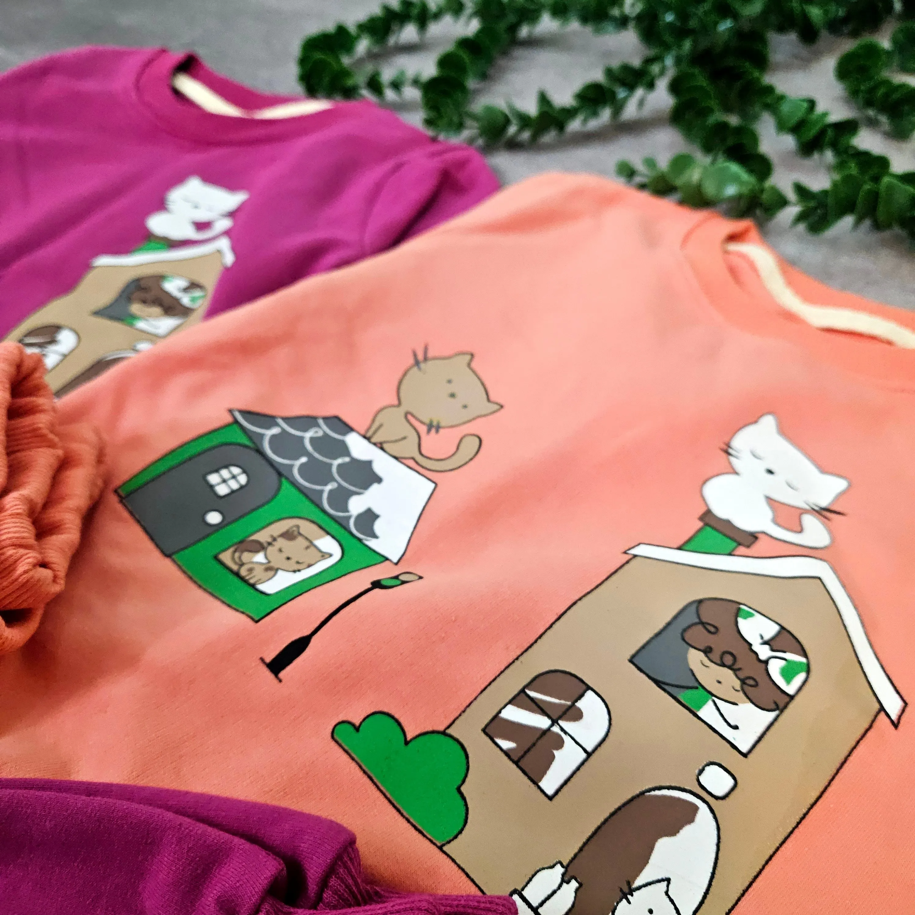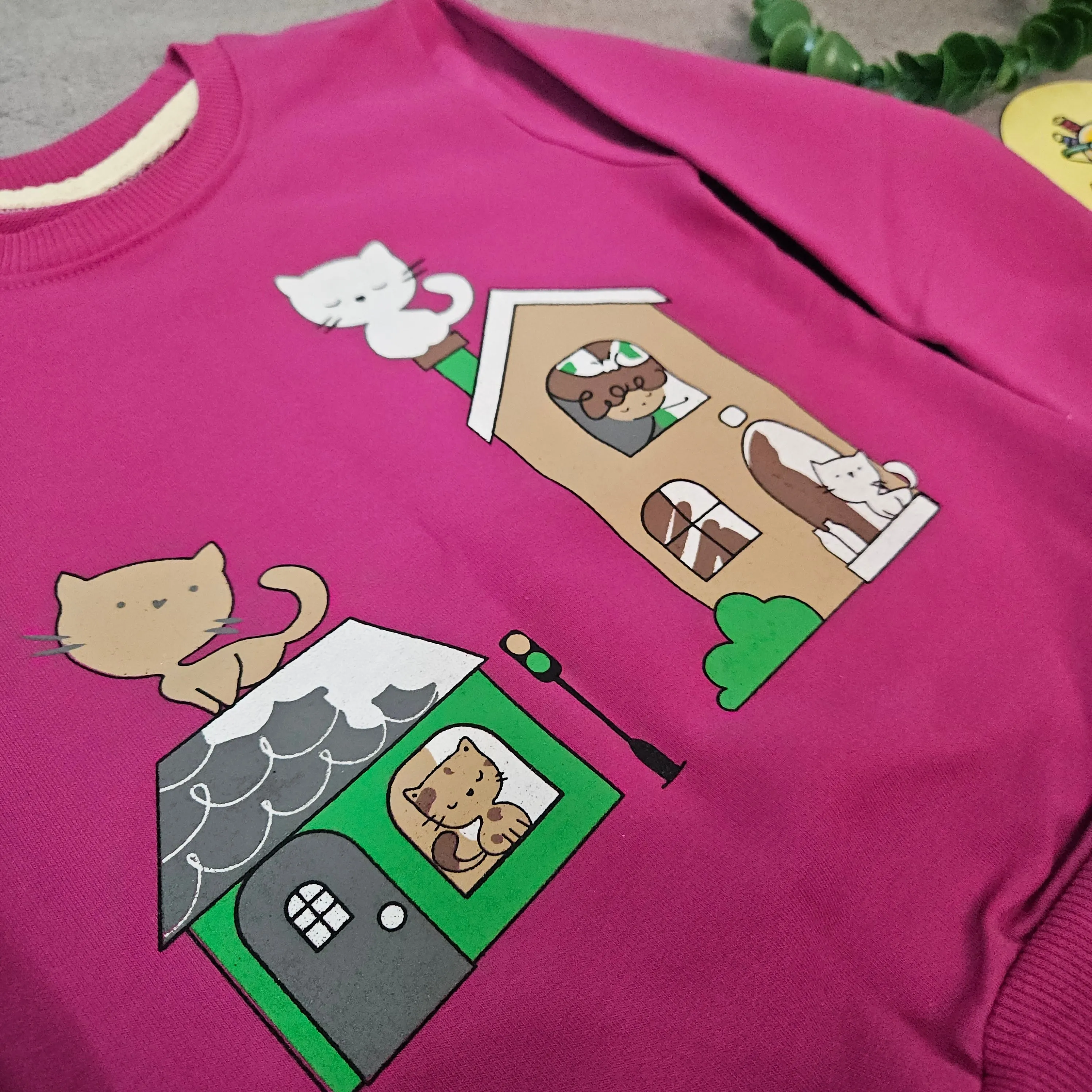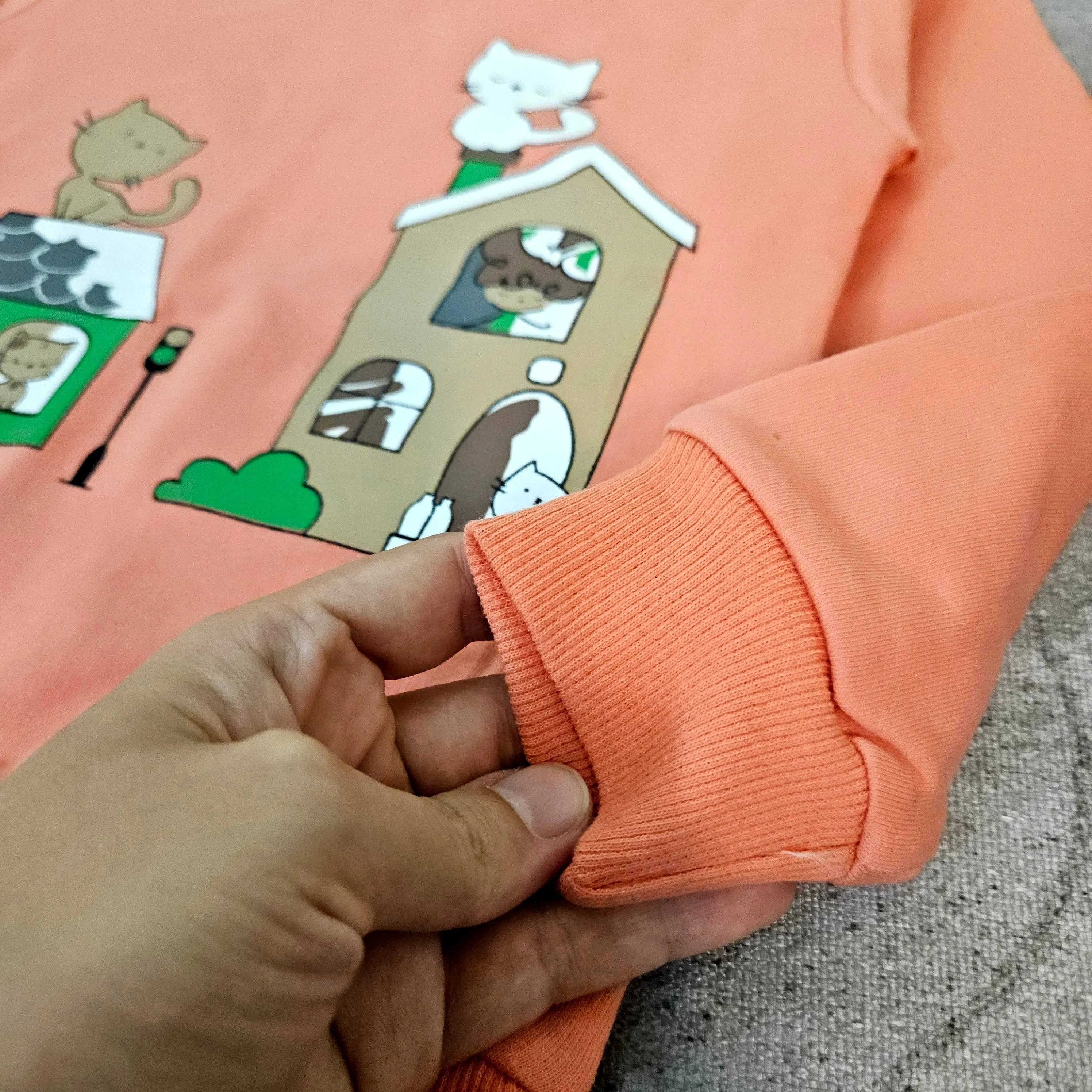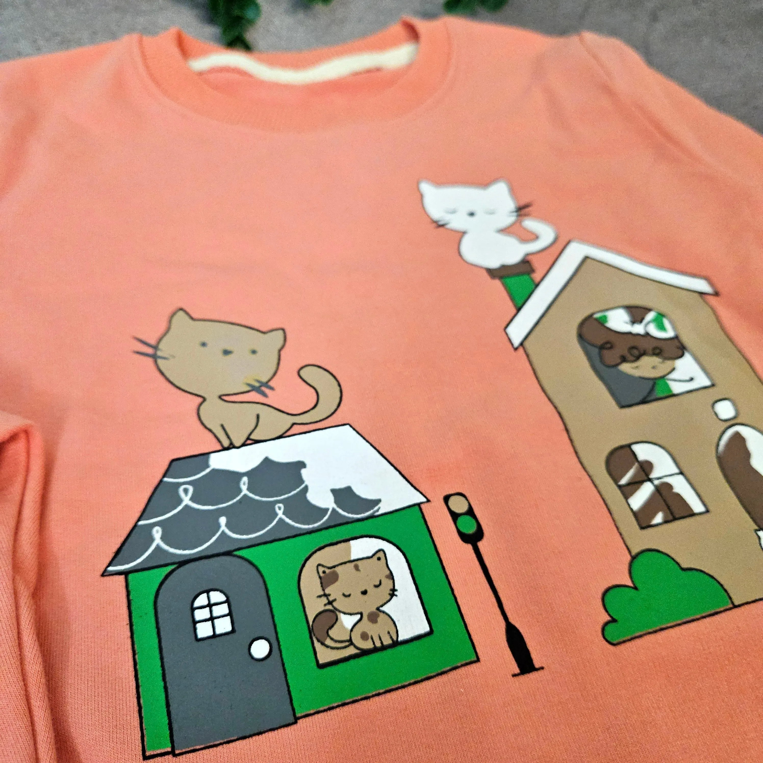 ست بلوز و شلوار بچگانه طرح گربه و خانه، پنبه دورس لاکرا، مناسب 1 تا 5 سال