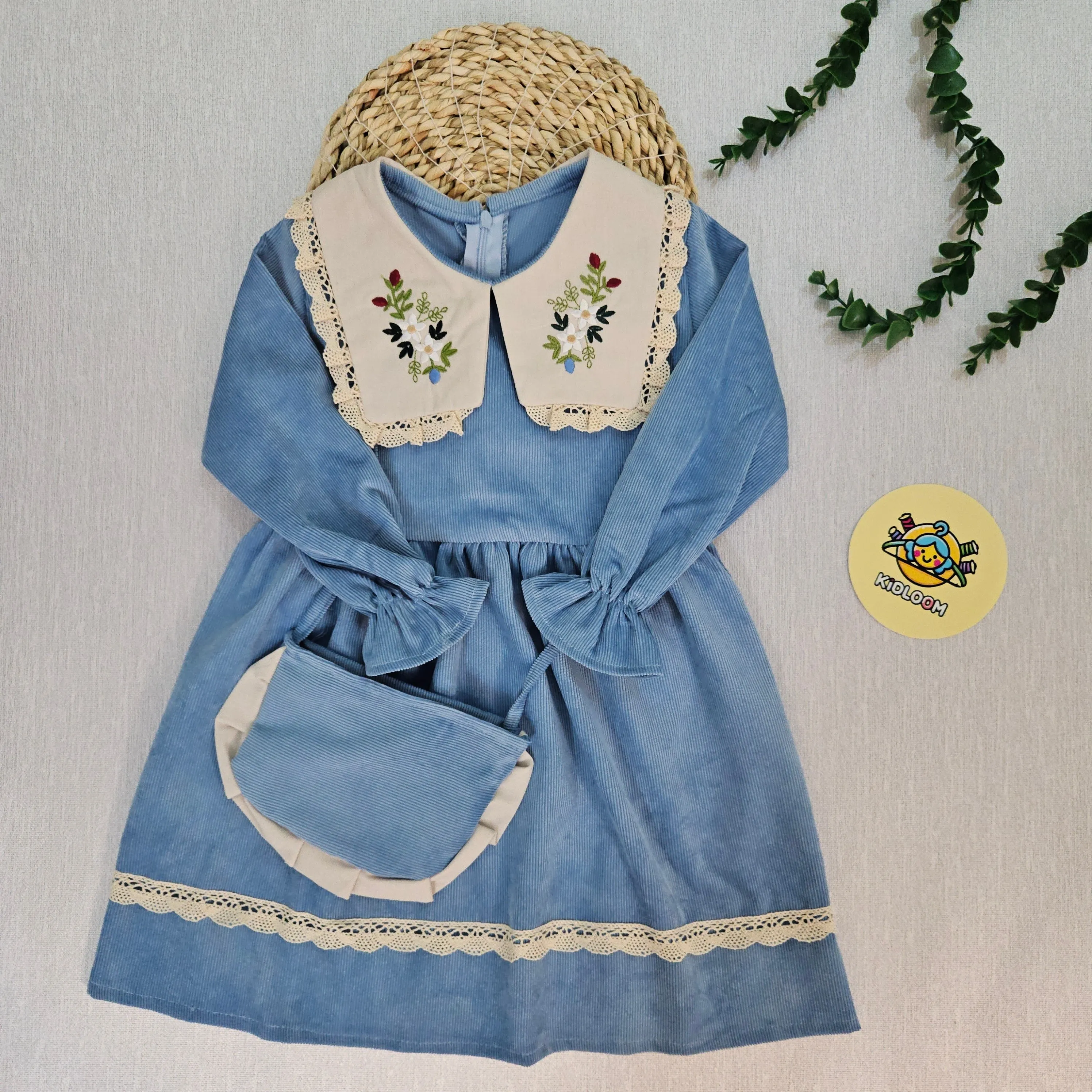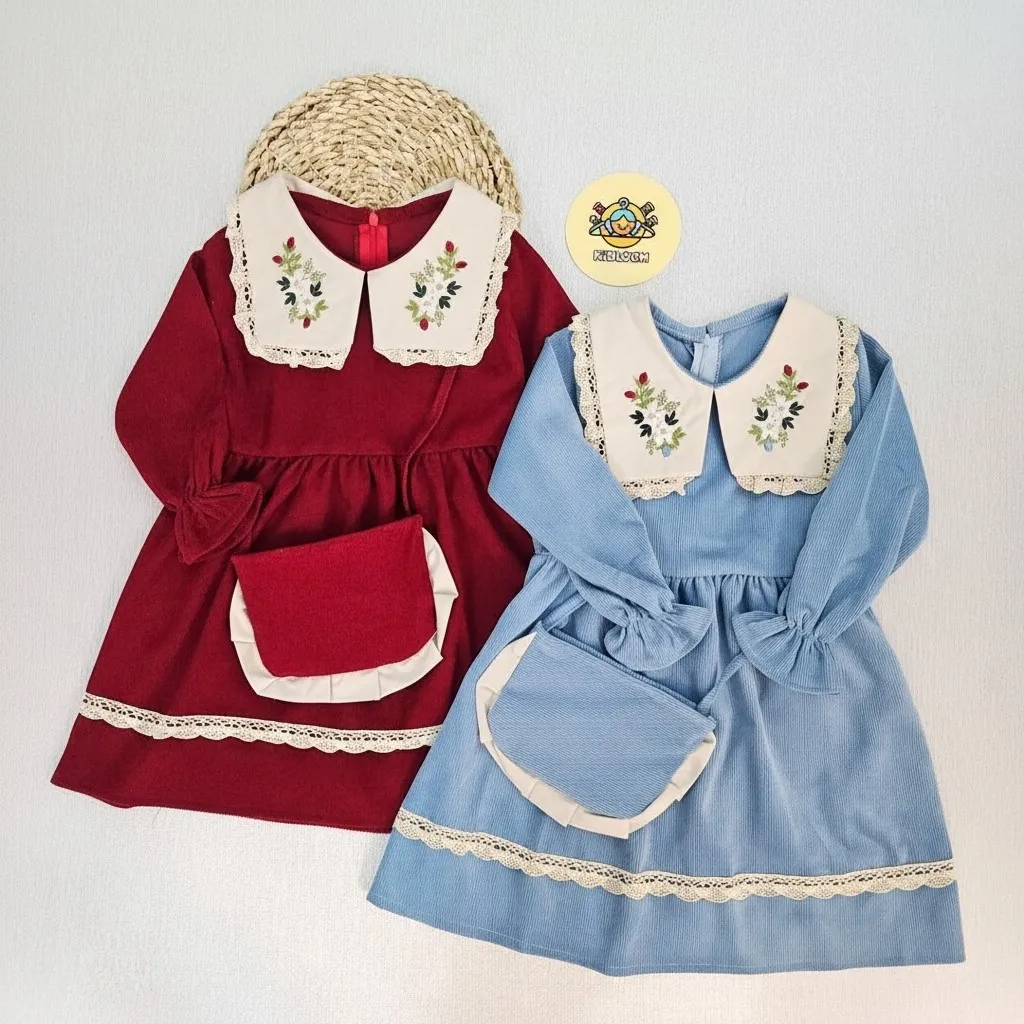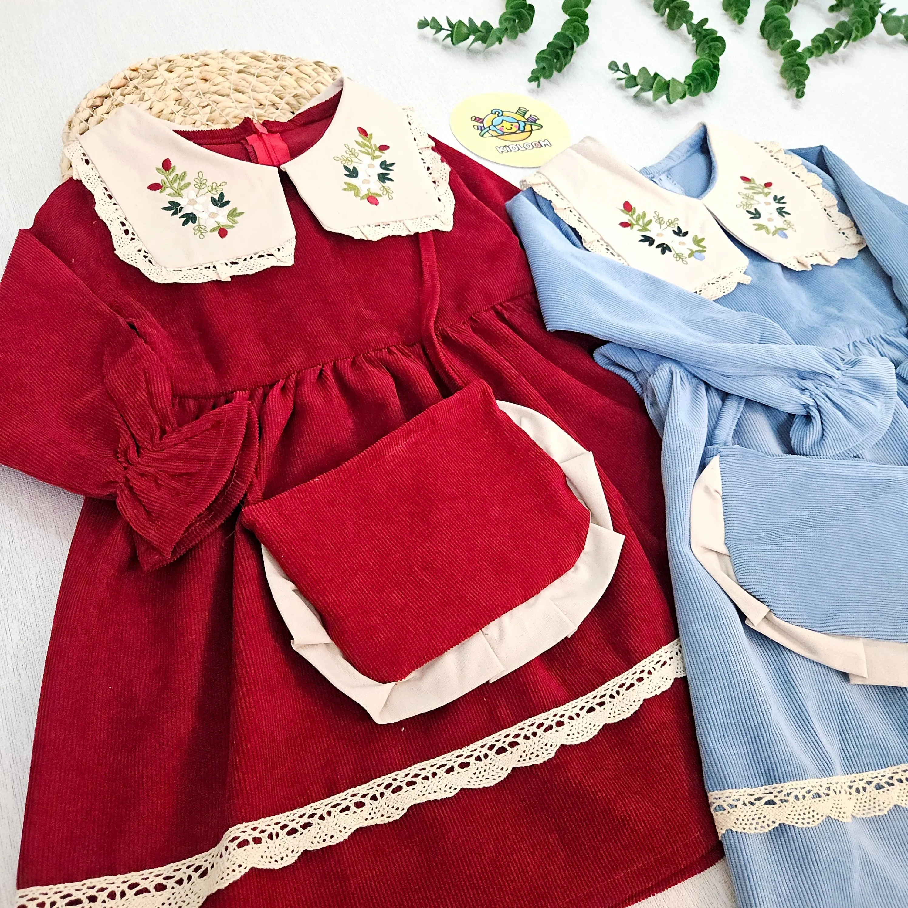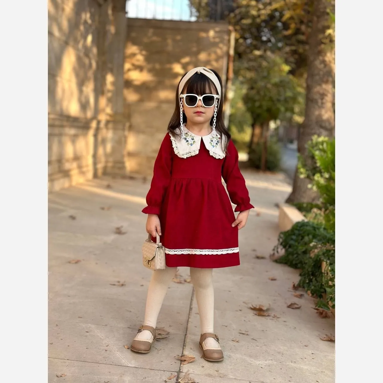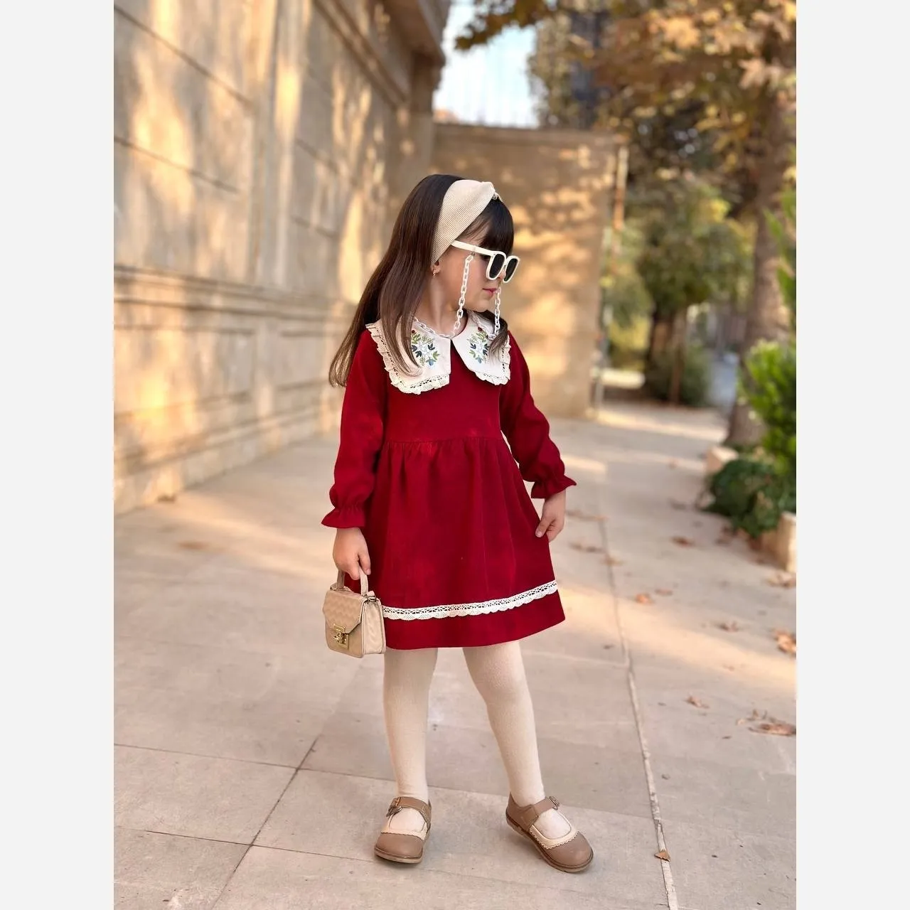 پیراهن مخمل کبریتی دخترانه یقه گلدوزی شده با کیف ست