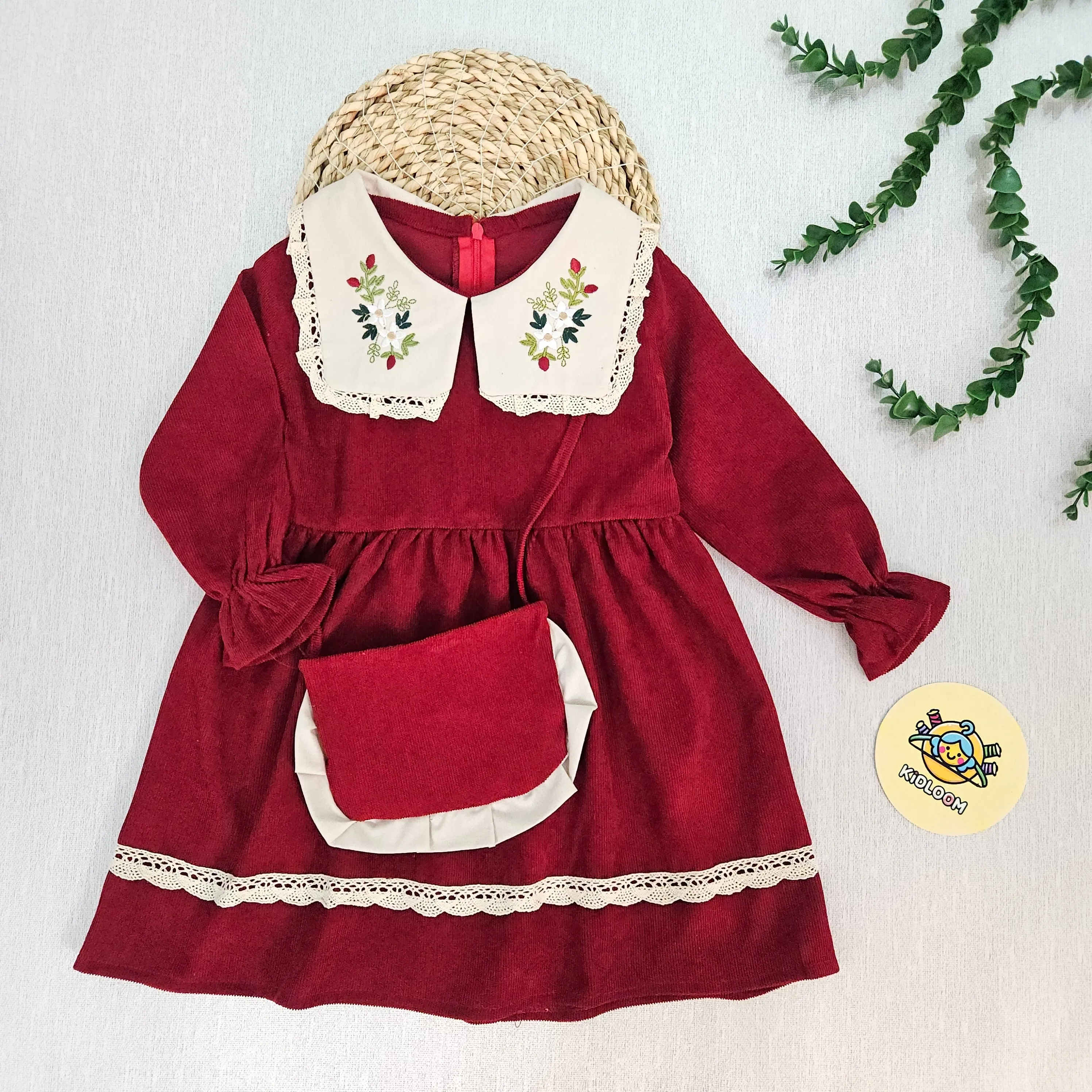 پیراهن مخمل کبریتی دخترانه یقه گلدوزی شده با کیف ست | لباس مجلسی کودک