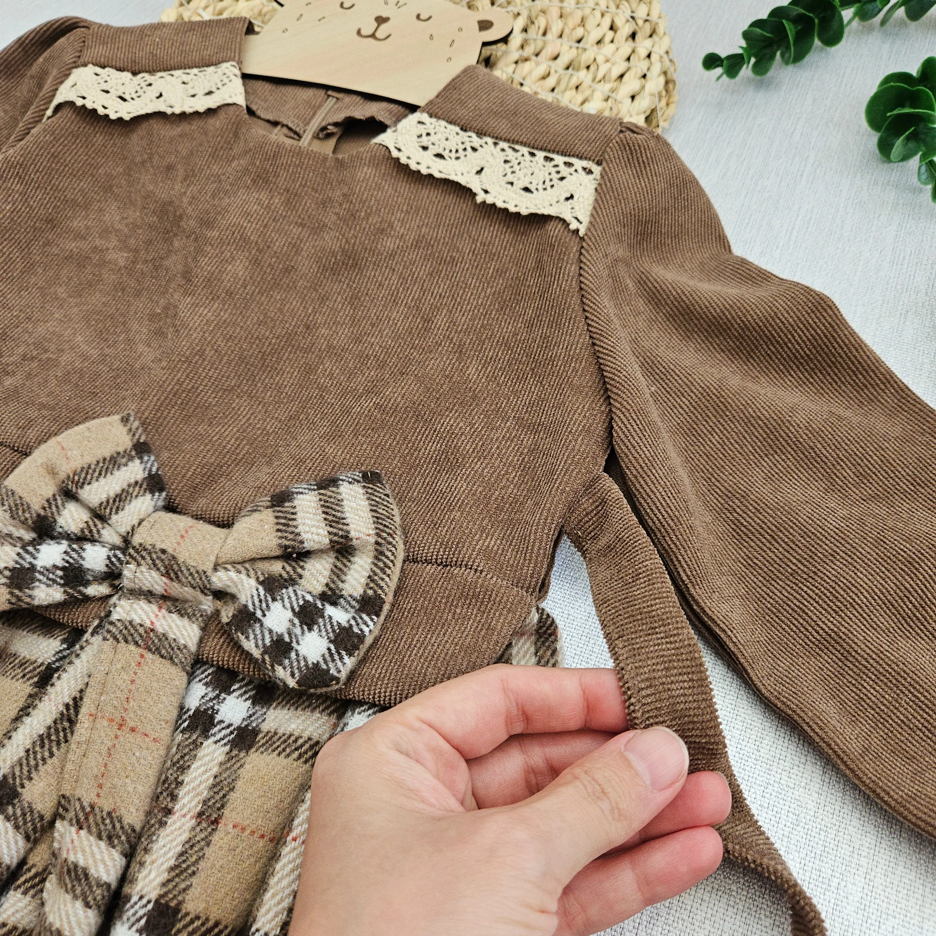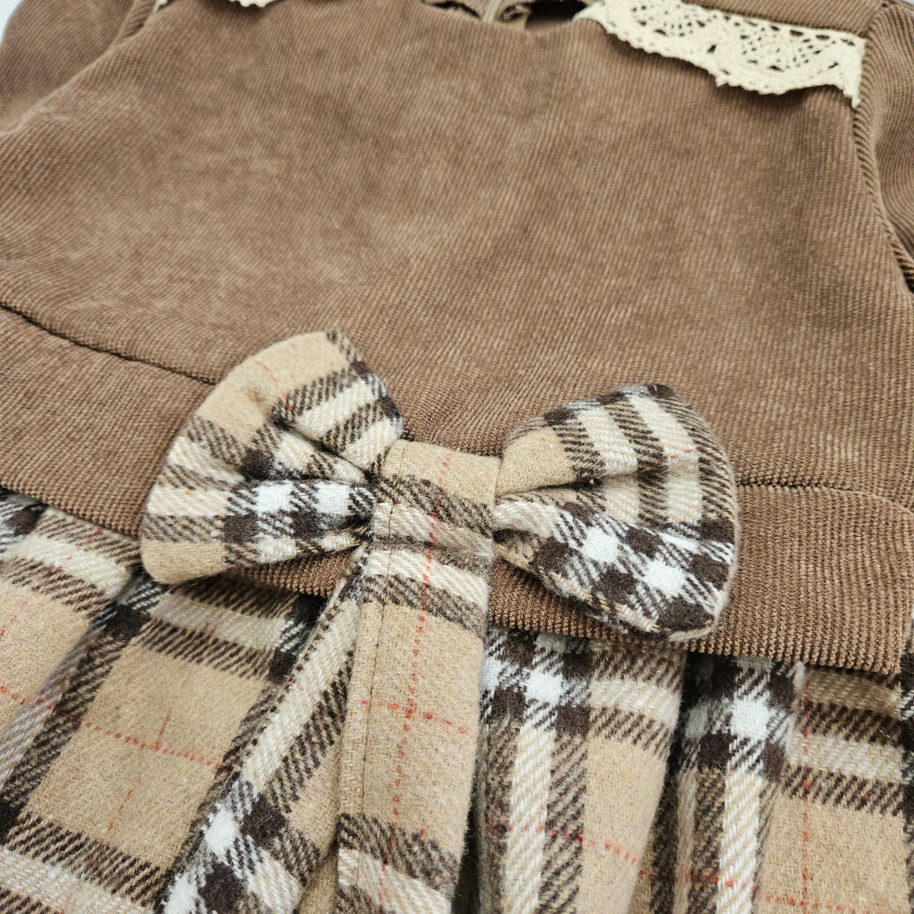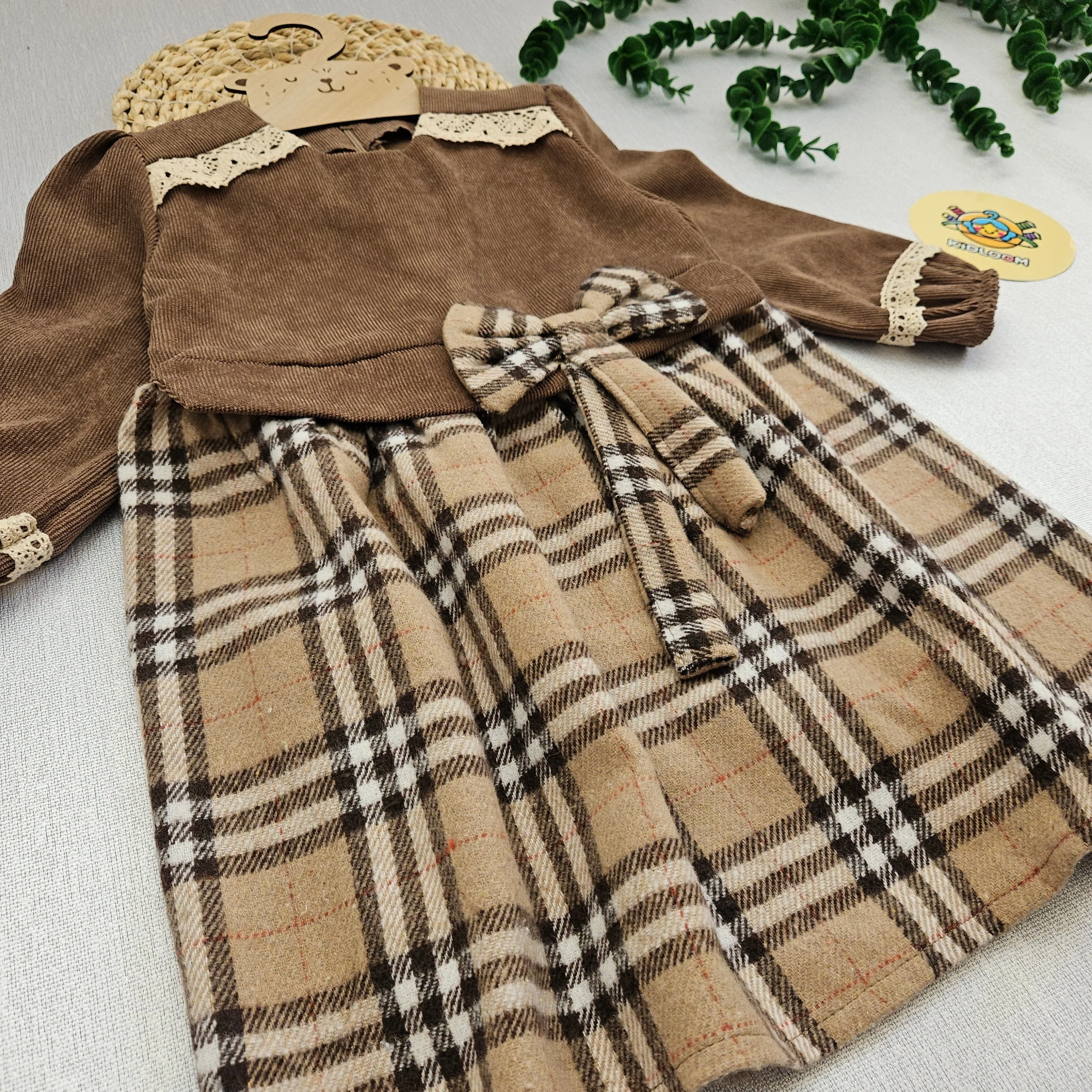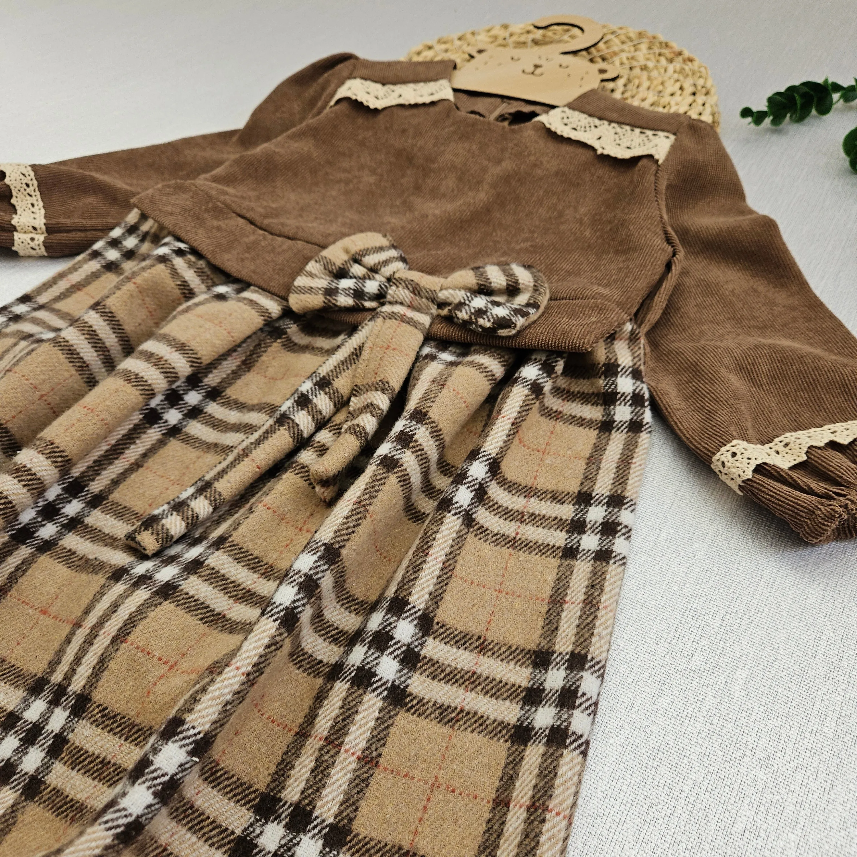 پیراهن دخترانه مخمل کبریتی و چهارخانه با گیپور و پاپیون