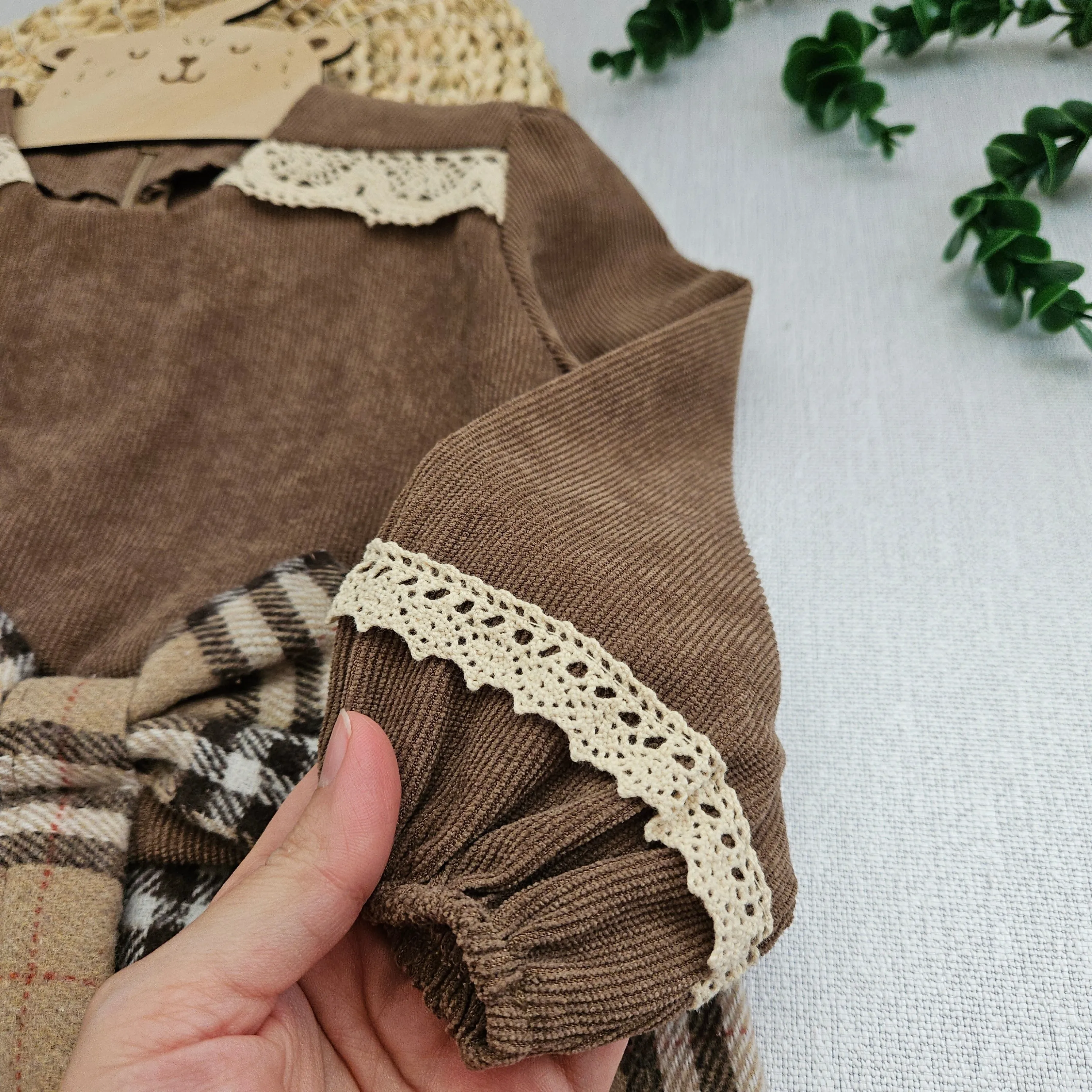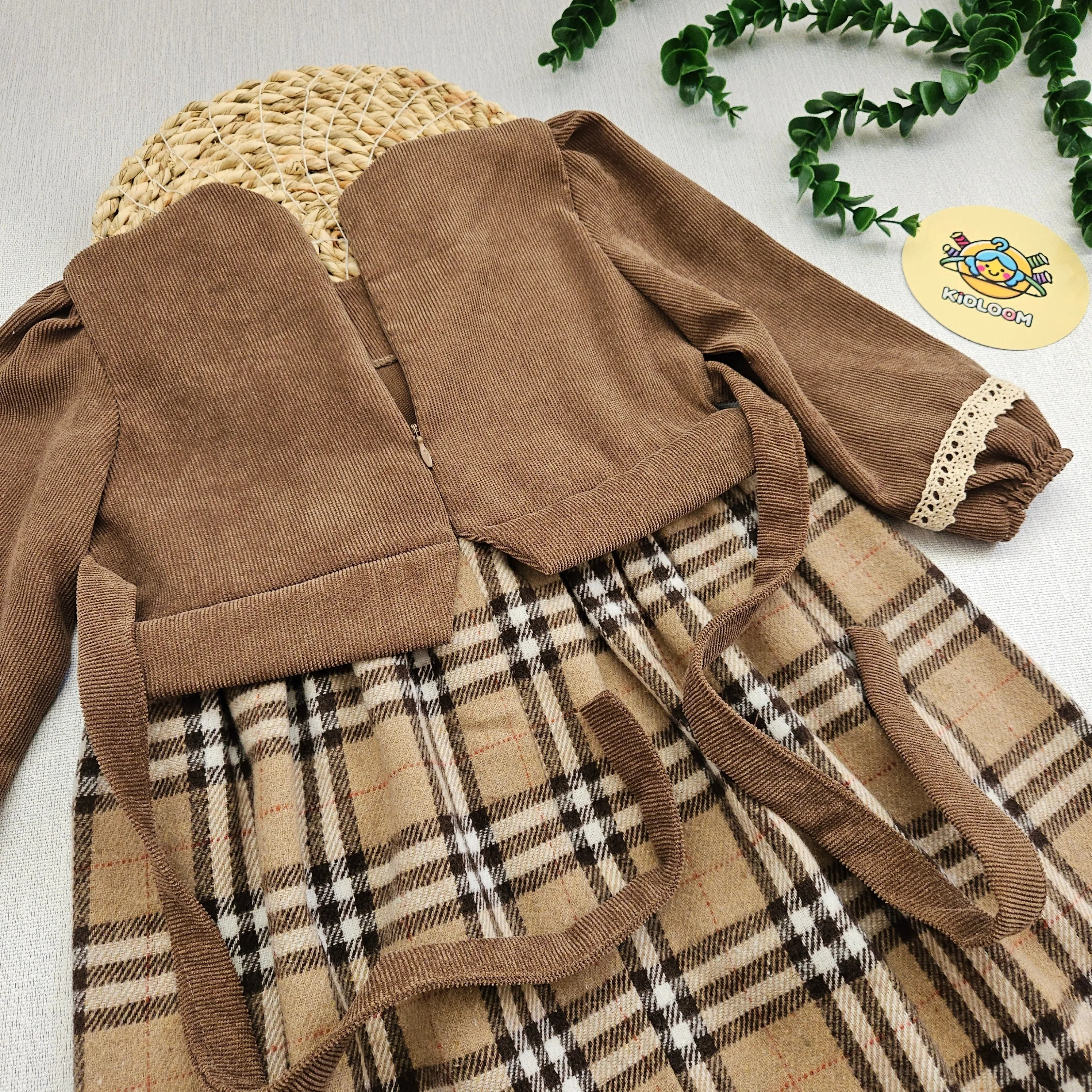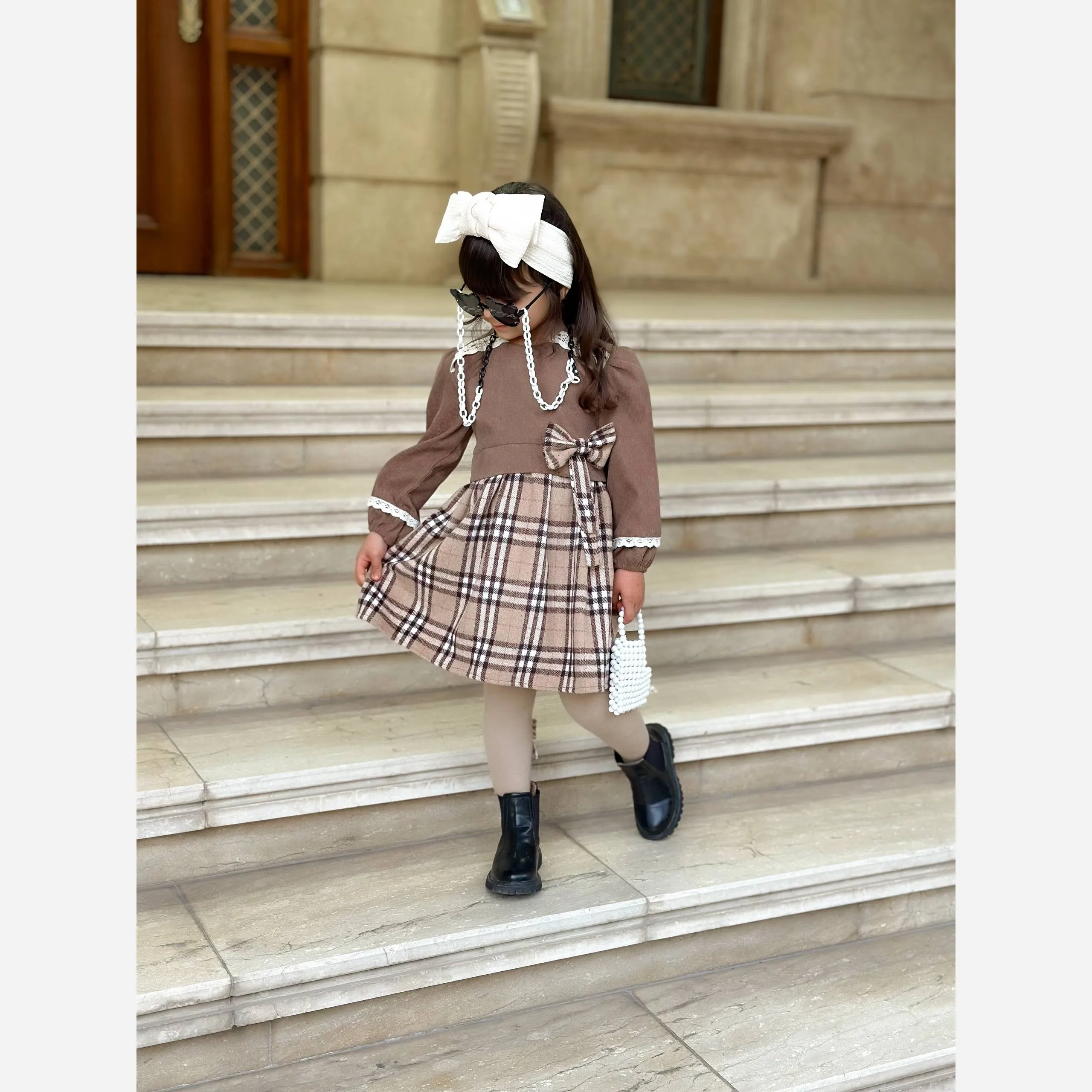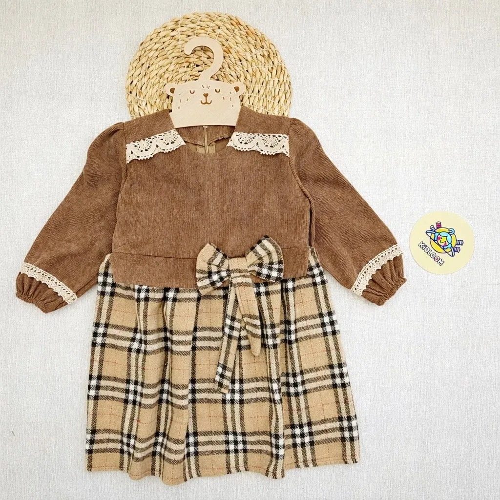 پیراهن دخترانه مخمل کبریتی و چهارخانه با گیپور و پاپیون