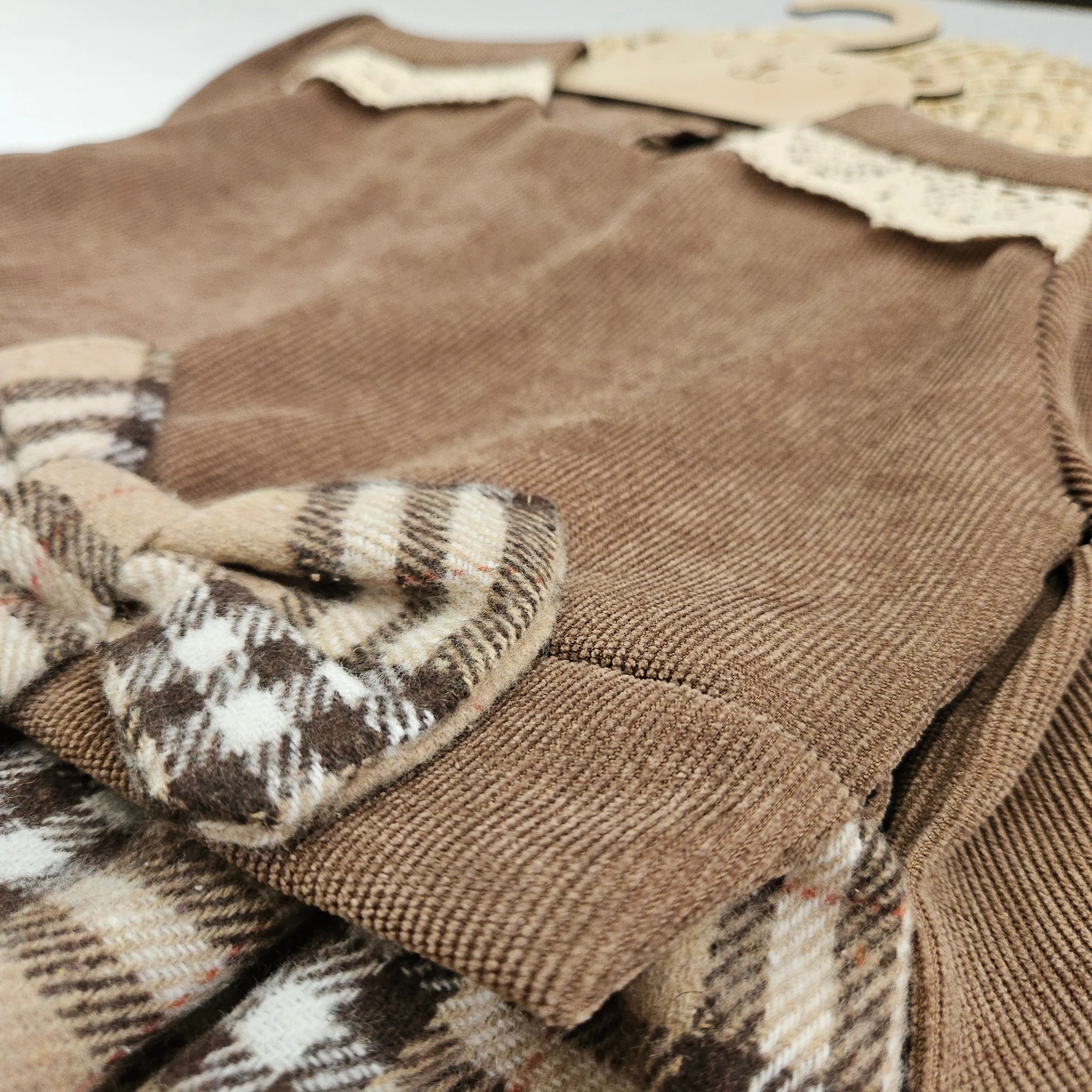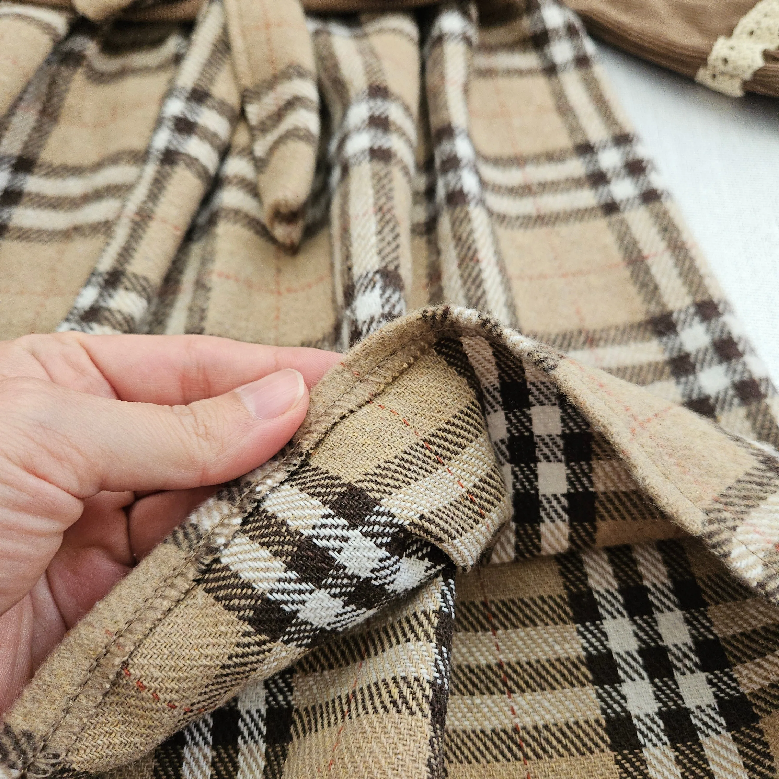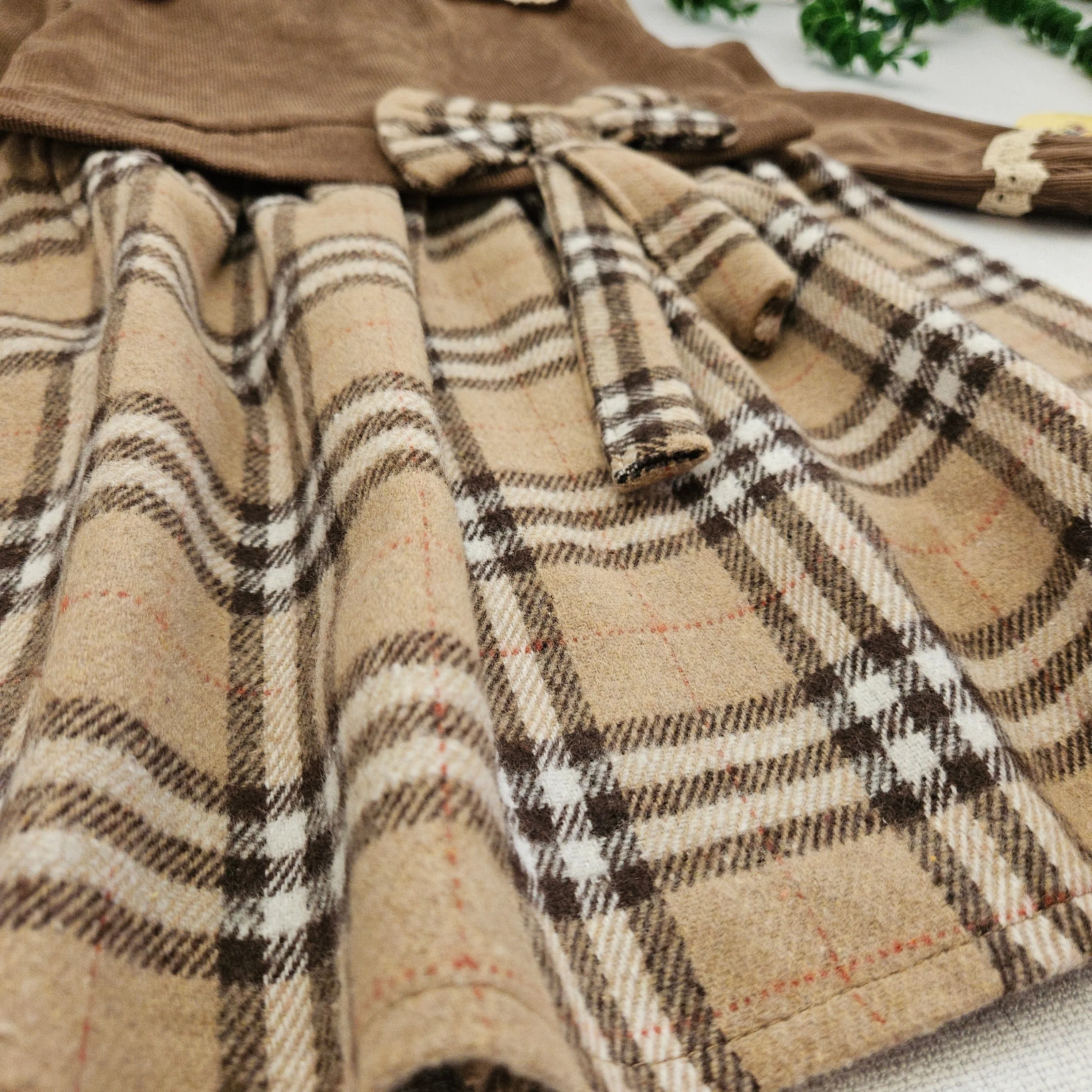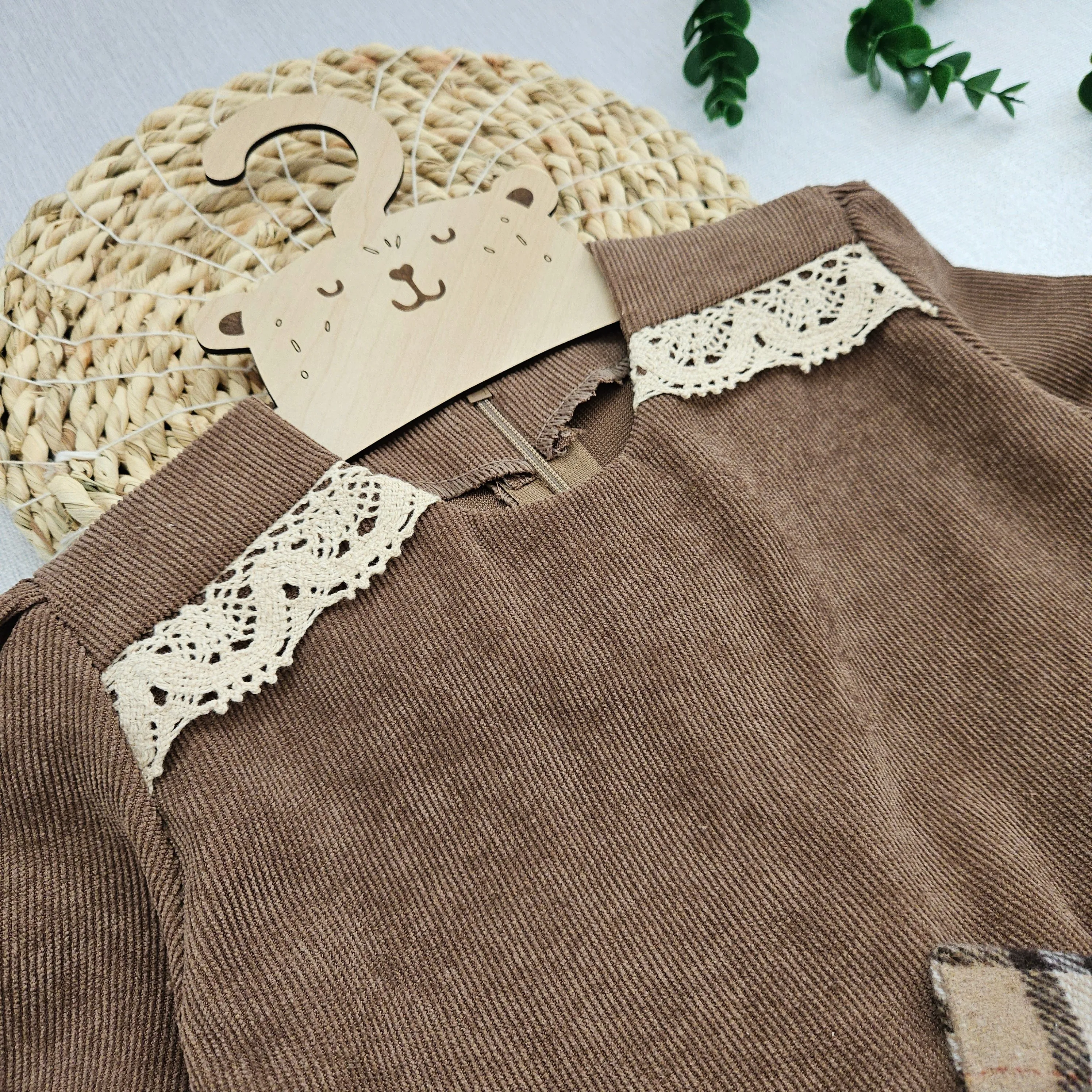 پیراهن دخترانه مخمل کبریتی و چهارخانه با گیپور و پاپیون