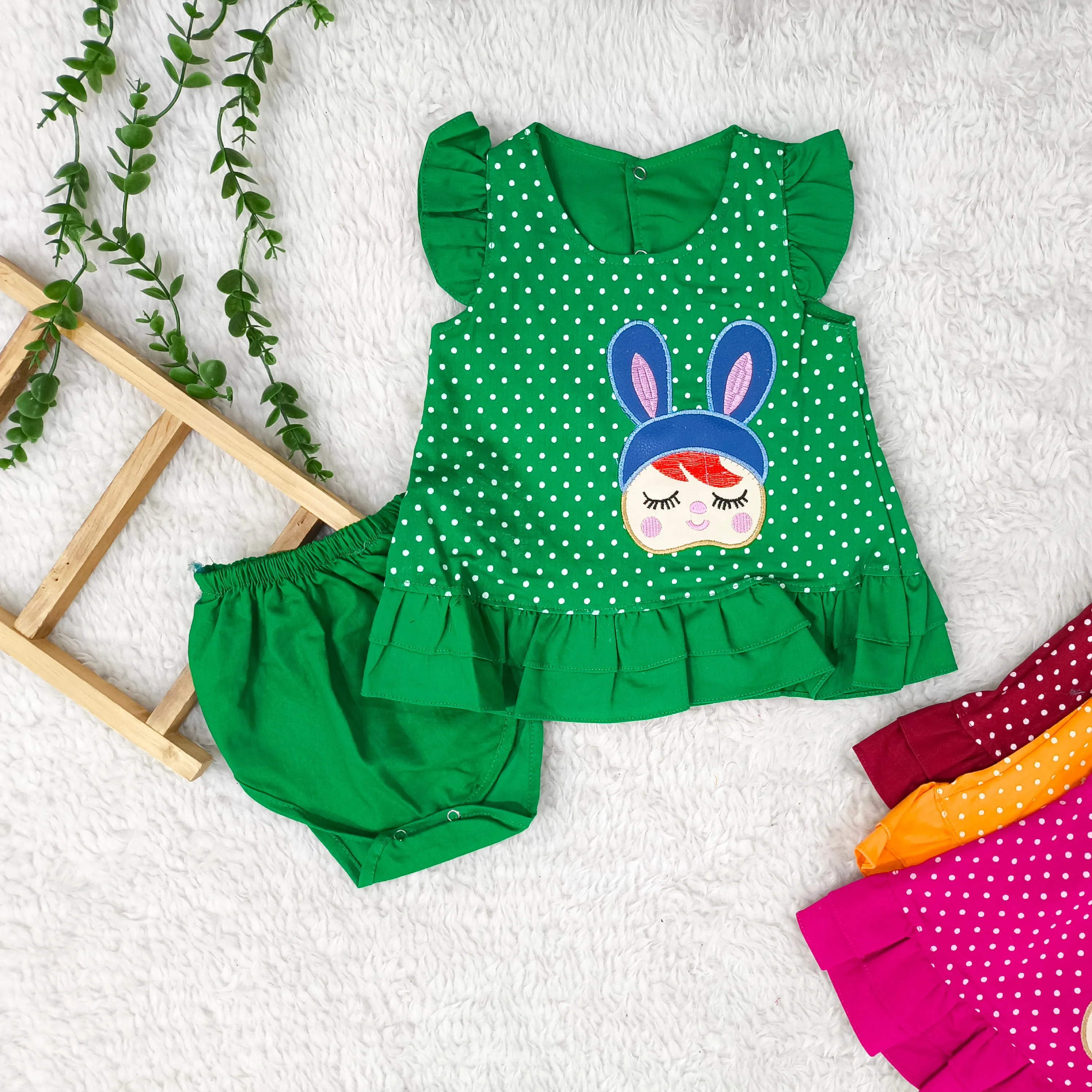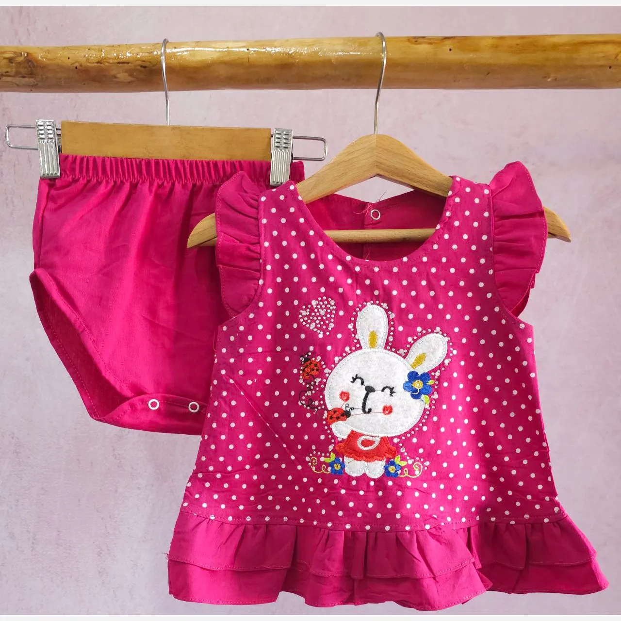 ست سارافون و شورت نوزادی دخترانه طرح خال خالی خرگوشی | کتان نخ خنک