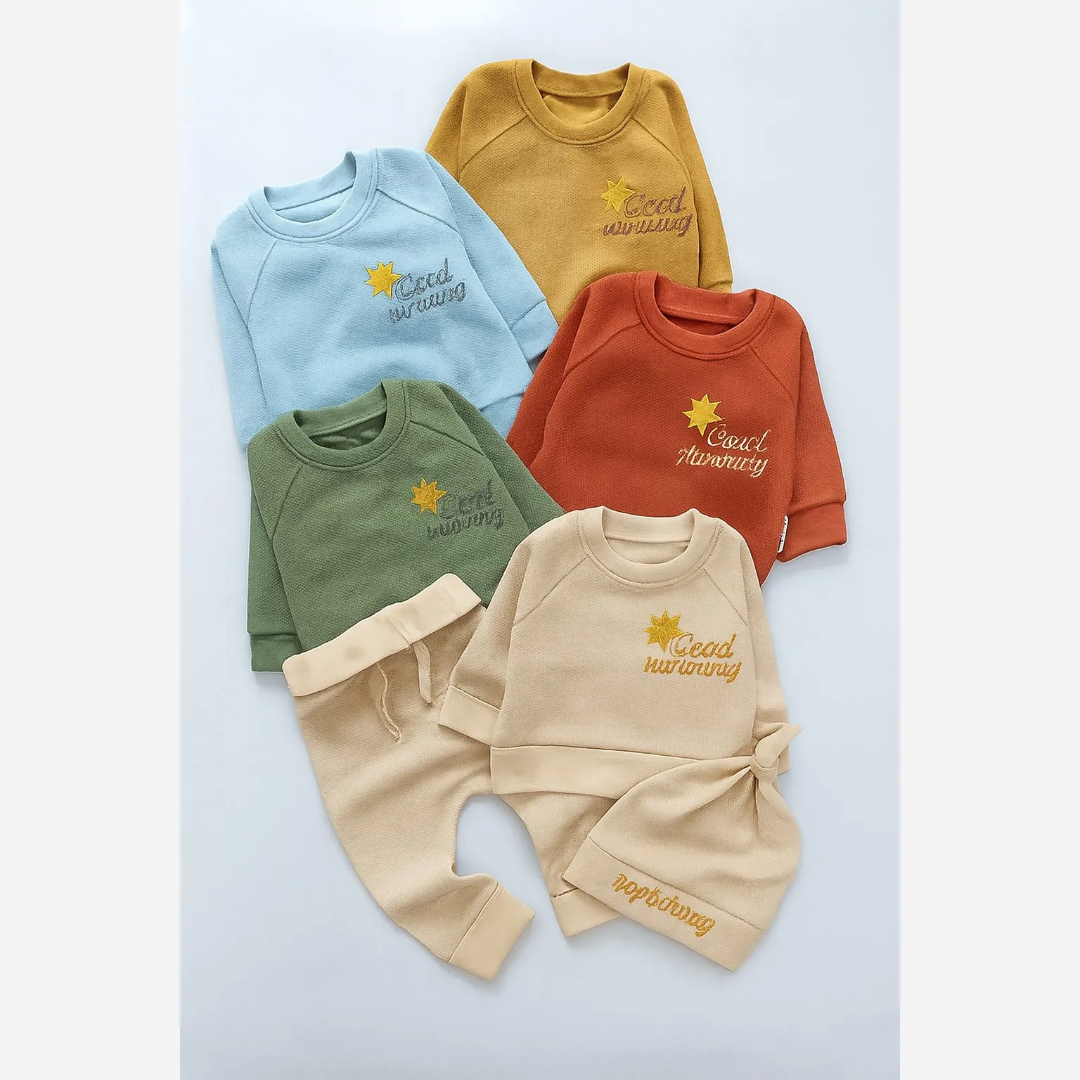 ست بلوز شلوار و کلاه نوزادی طرح Good Morning جنس پنبه بیسکوئیتی با کیفیت