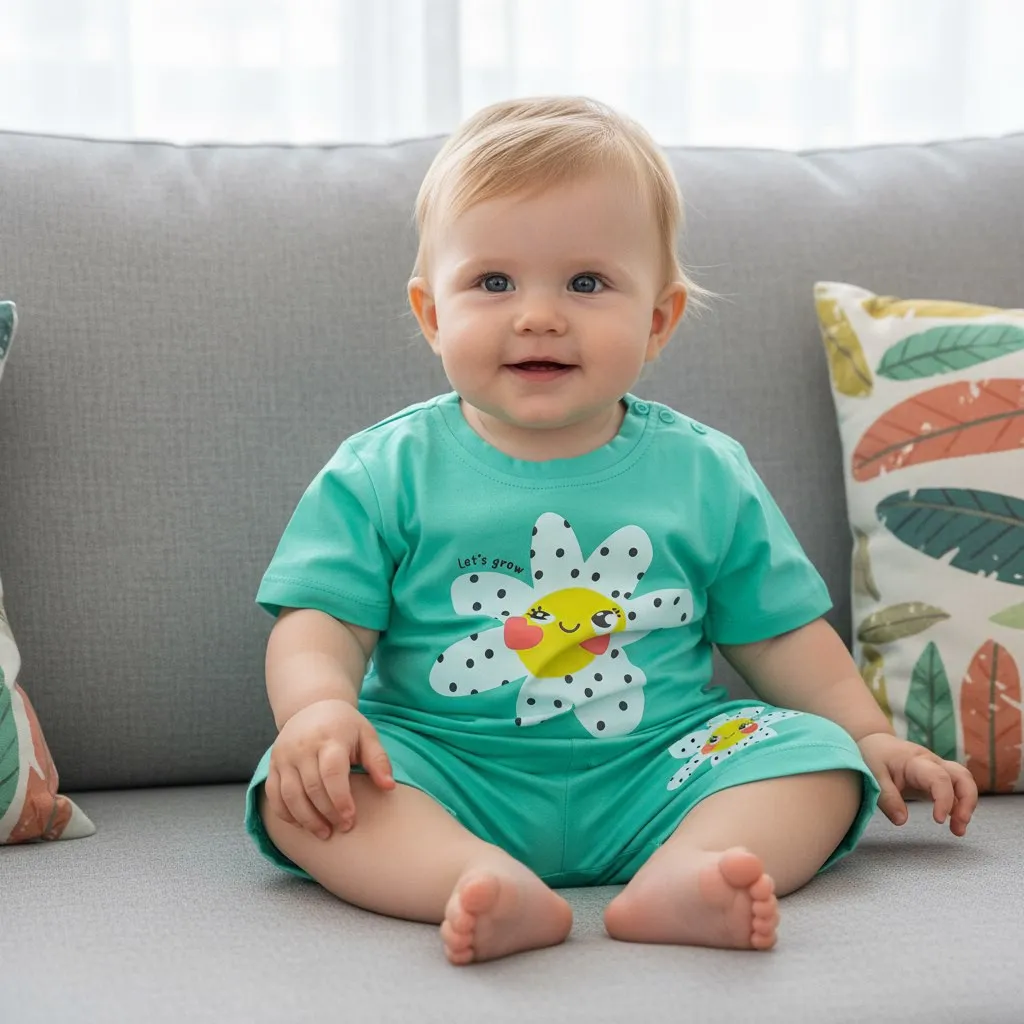ست تیشرت و شورتک نخی طرح بابونه دخترانه و پسرانه خندان
