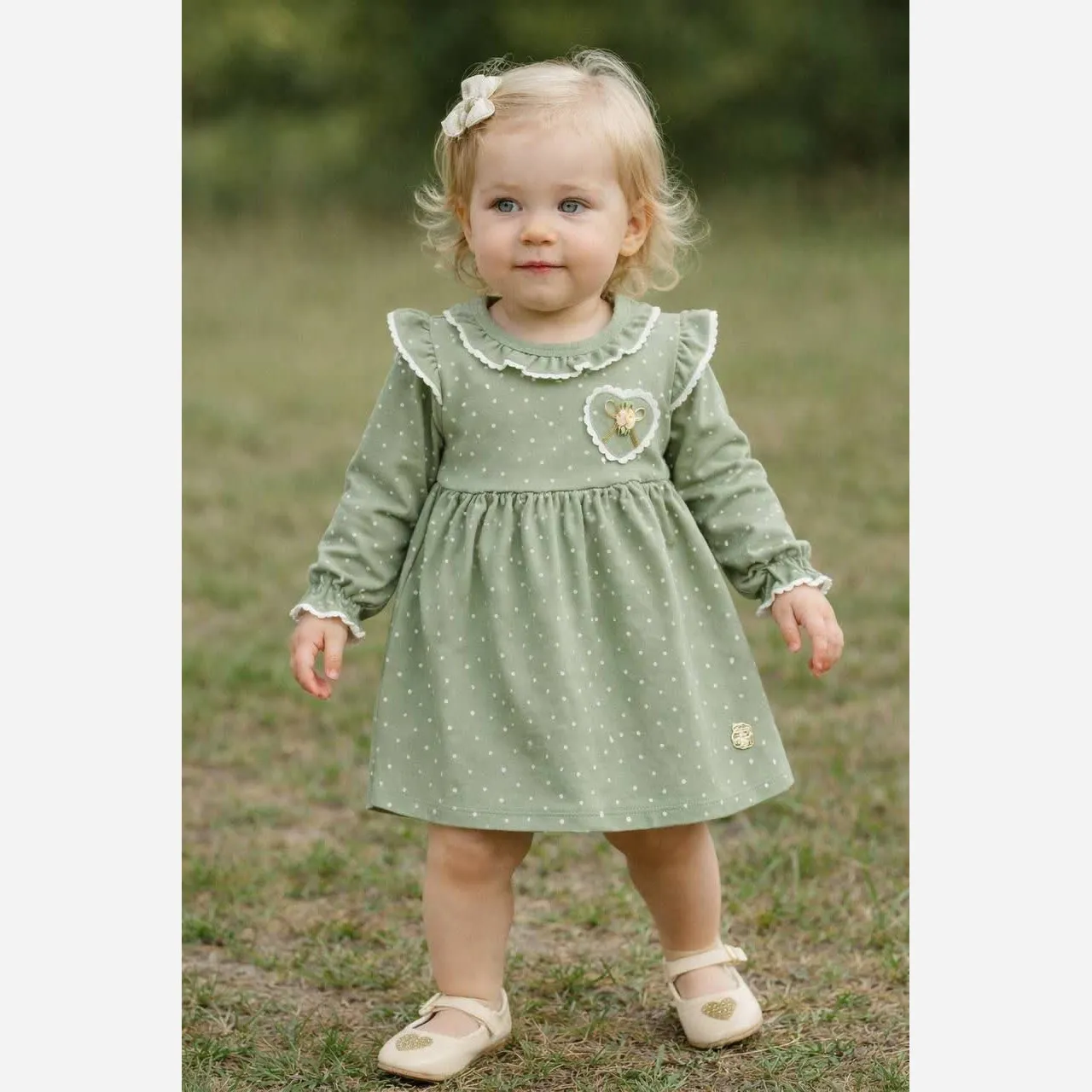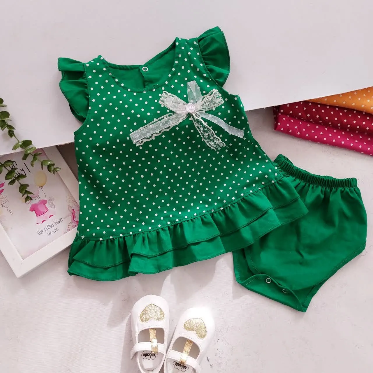 بادی دامنی دخترانه سبز خالدار نوزادی | لباس راحتی و مجلسی | 6 تا 24 ماه