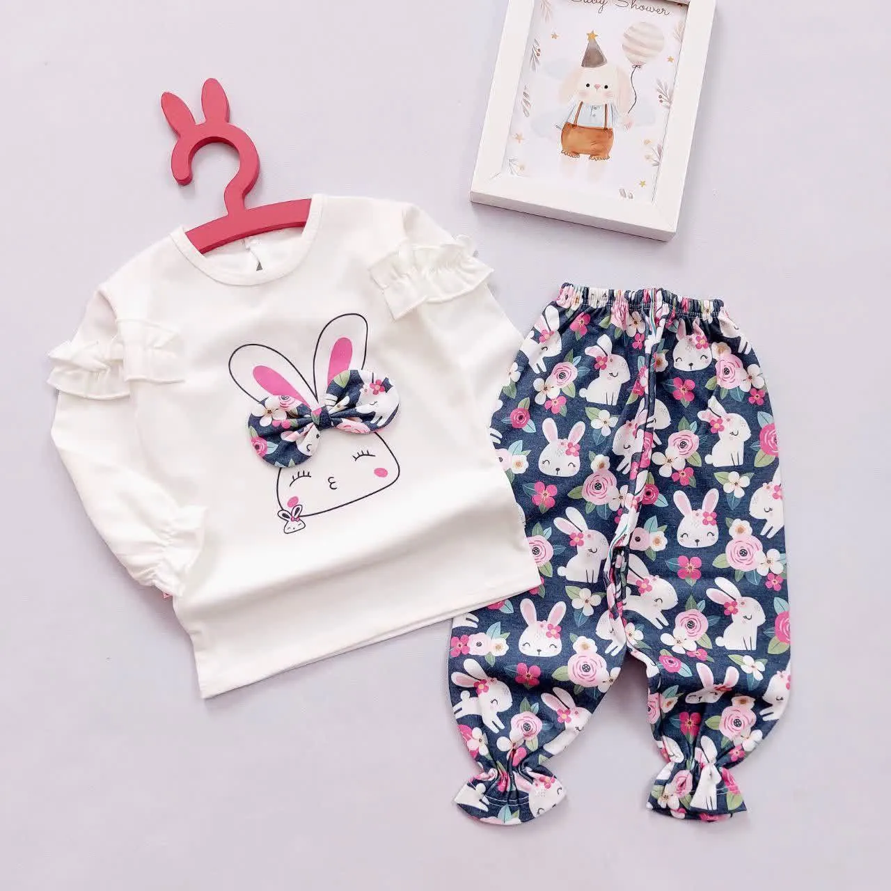 بلوز شلوار دخترانه طرح خرگوش پاپیونی آستین چین دار جنس پنبه لطیف