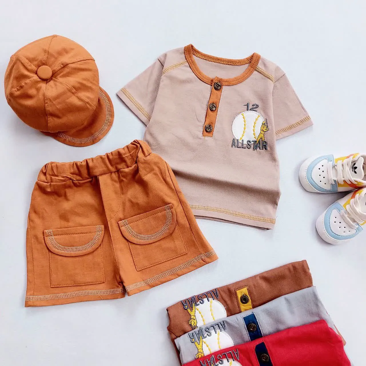 ست تیشرت شلوارک و کلاه پسرانه طرح بیسبالی نخی دورو پنبه کیفیت عالی