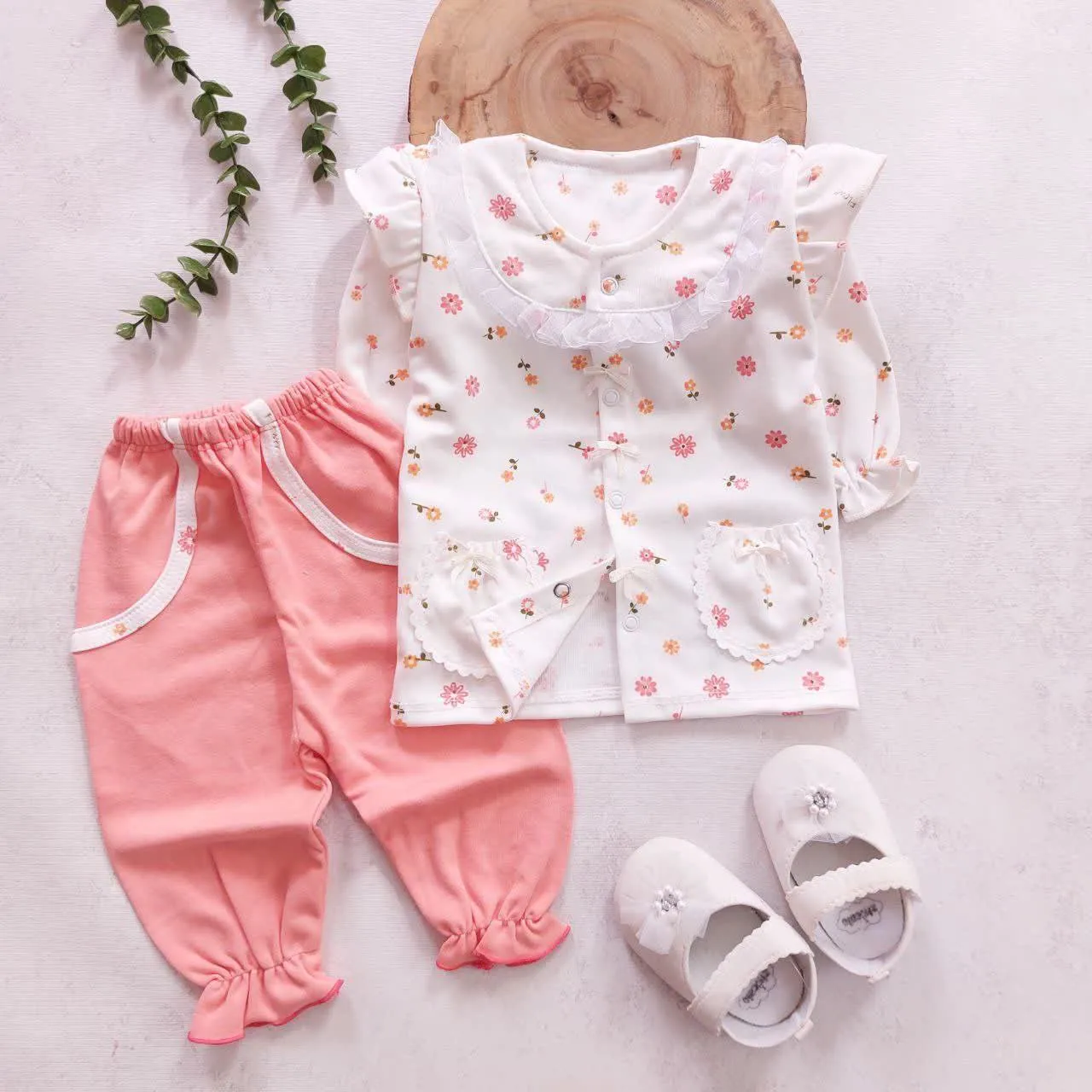 مانتو شلوار نوزادی گل گلی طرح دار پنبه ای دخترانه | مناسب 6 ماه تا 3 سال