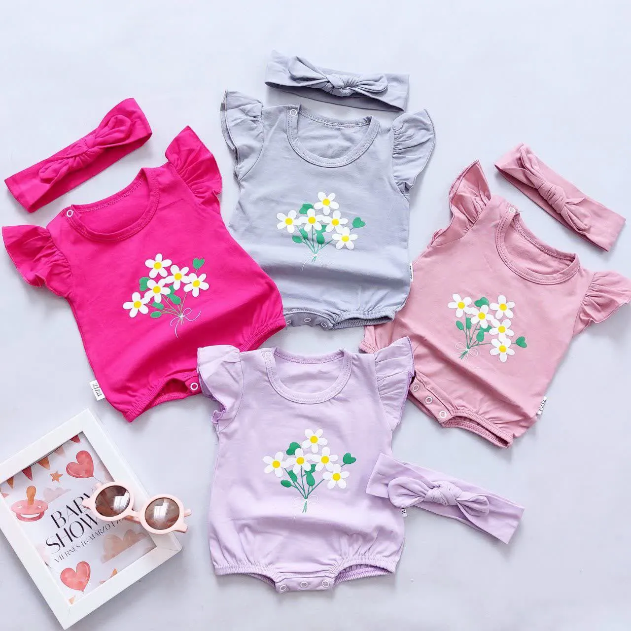 رامپر نوزادی دخترانه طرح گل با هدبند، لباس بهاره پنبه ای سایز 0 تا 8 ماه