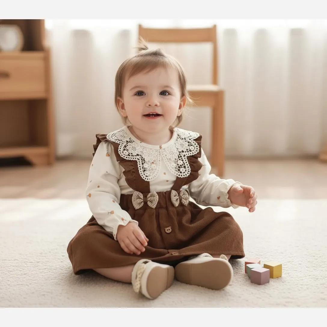 پیراهن کتان دخترانه یقه ب ببری آستین بلند مناسب 6 ماه تا 3 سال
