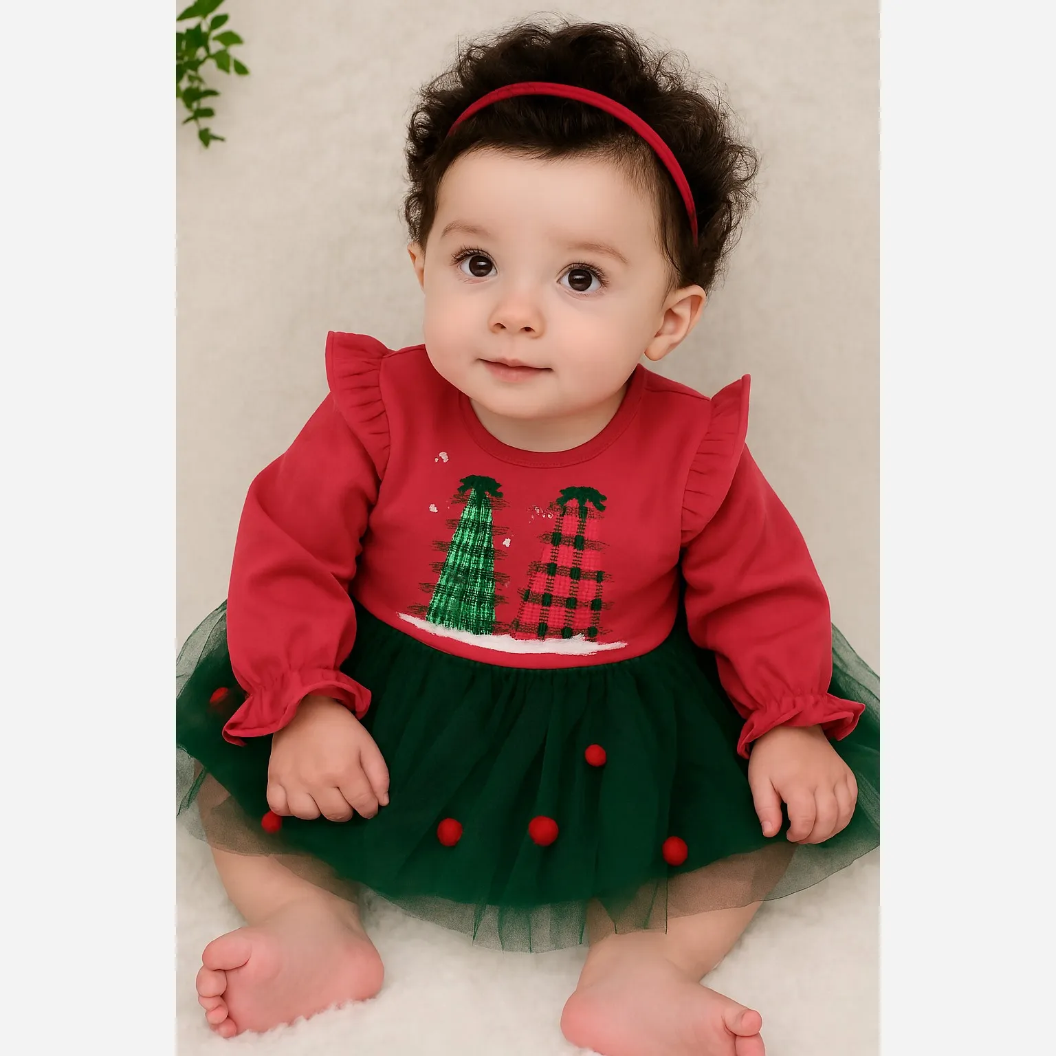 پیراهن دخترانه کریسمس طرح درخت، لباس مجلسی یلدا و کریسمس مناسب 6 ماه تا 3 سال