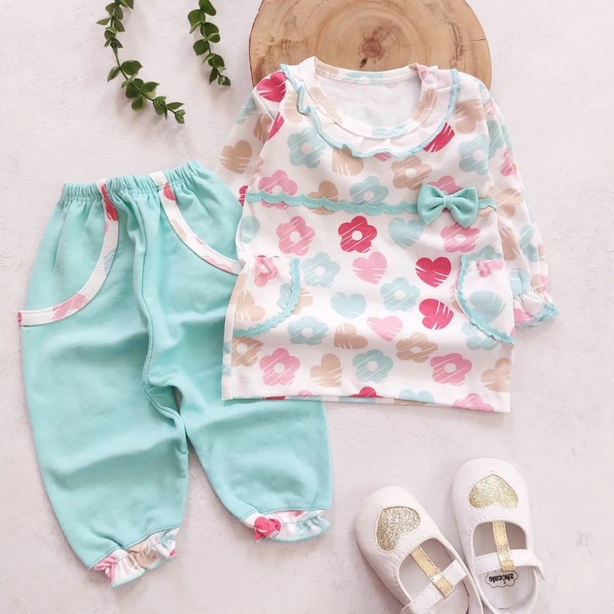 بلوز شلوار نوزادی طرح شکوفه و قلب | لباس راحتی دخترانه پنبه ای