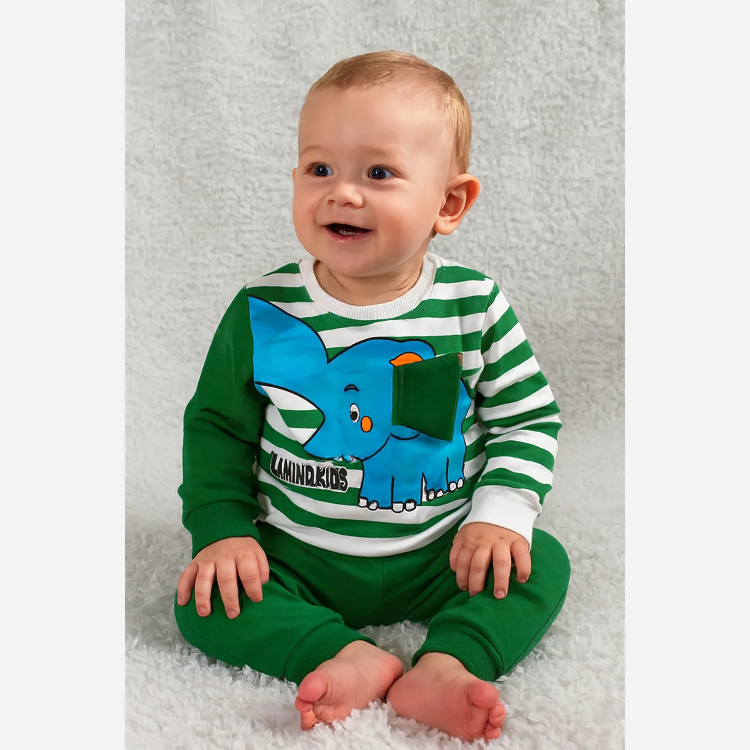 بلوز شلوار پسرانه طرح فیل راه راه نخی پنبه دورس مناسب 1 تا 4 سال