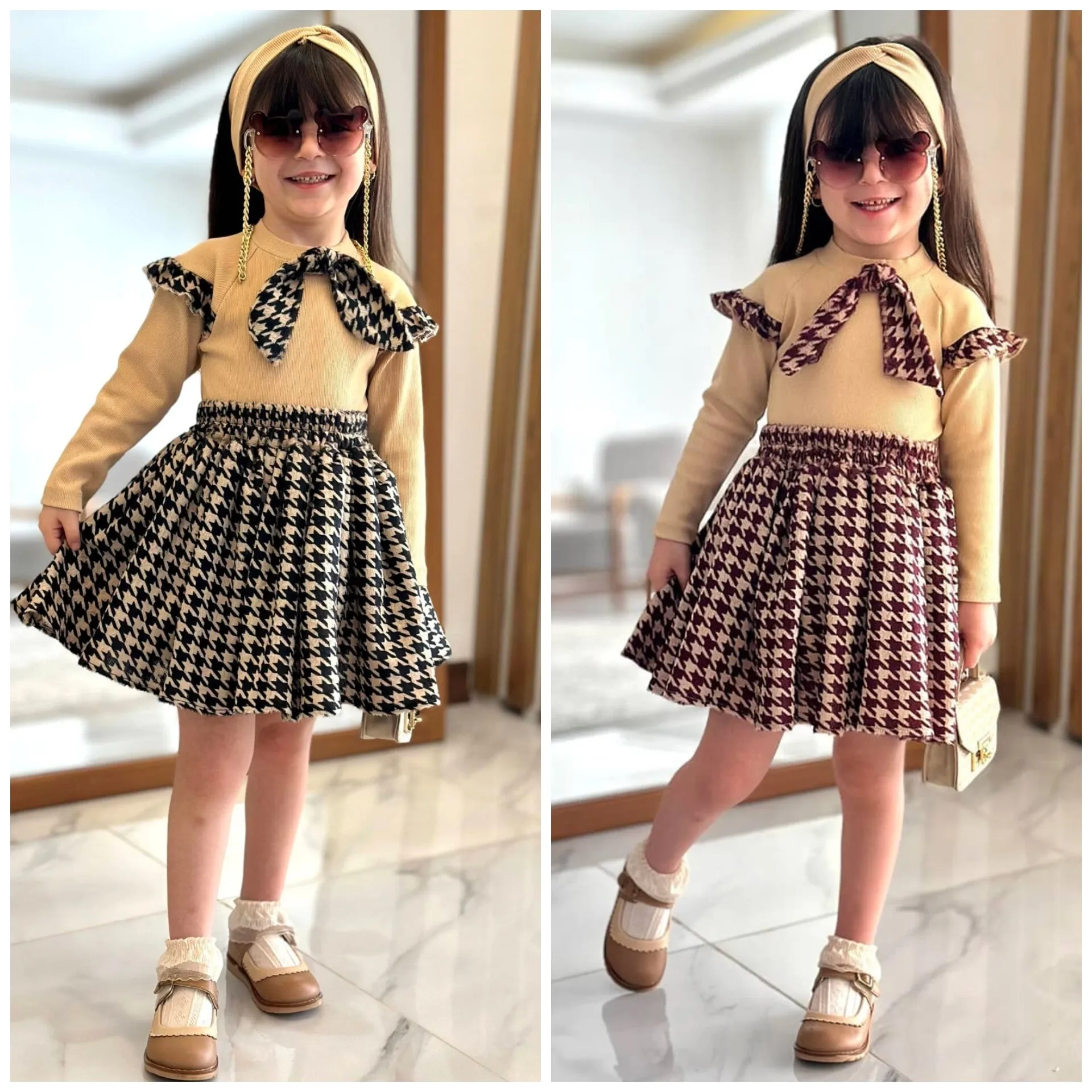 ست بلوز و دامن دخترانه طرح hounds tooth مخمل و فانریپ مناسب 2 تا 13 سال