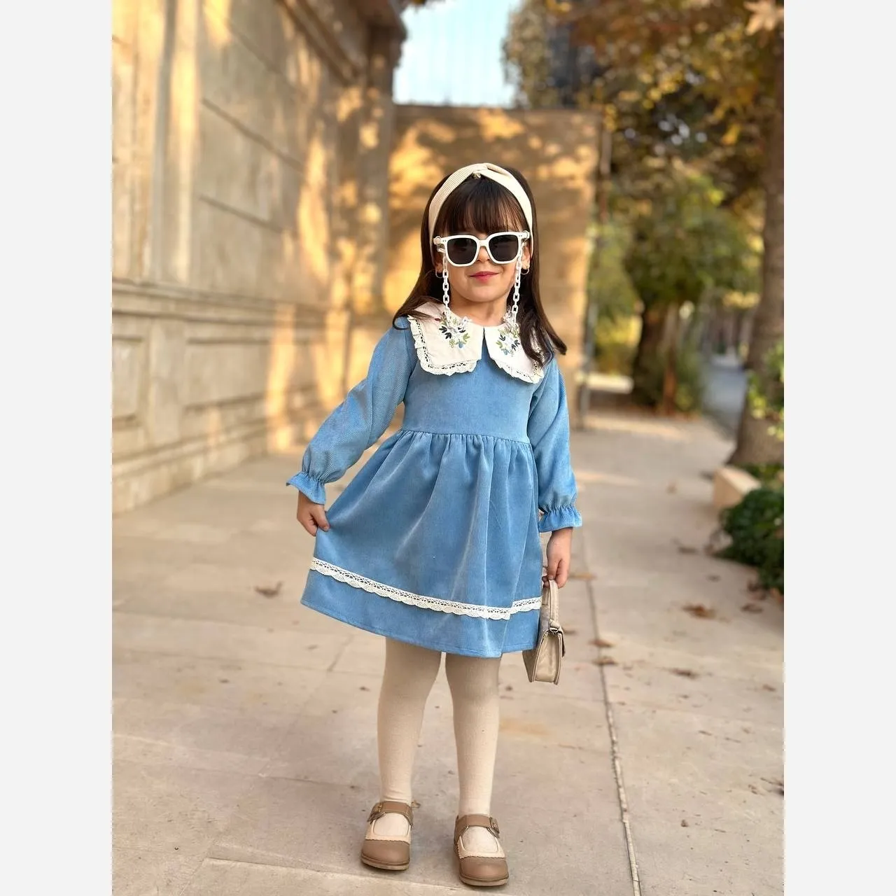 پیراهن مخمل کبریتی دخترانه یقه گلدوزی شده با کیف ست | لباس مجلسی کودک