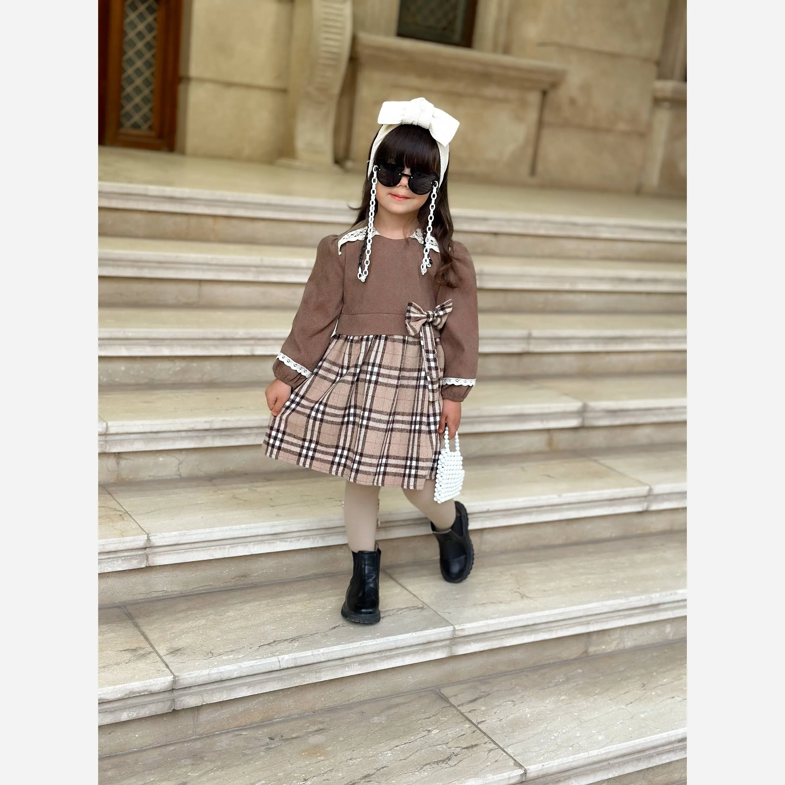 پیراهن دخترانه مخمل کبریتی و چهارخانه با گیپور و پاپیون | مناسب 2 تا 12 سال